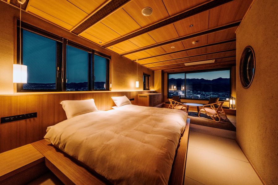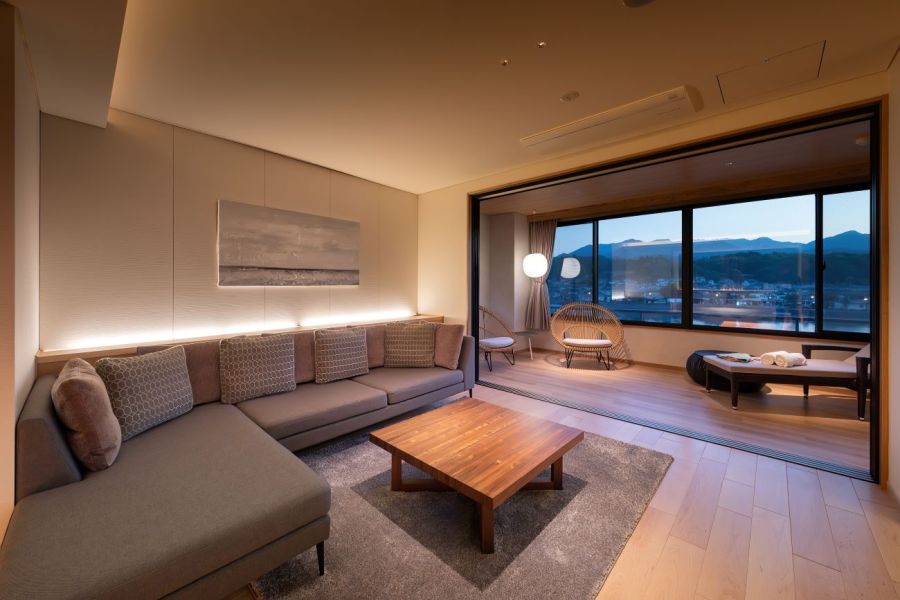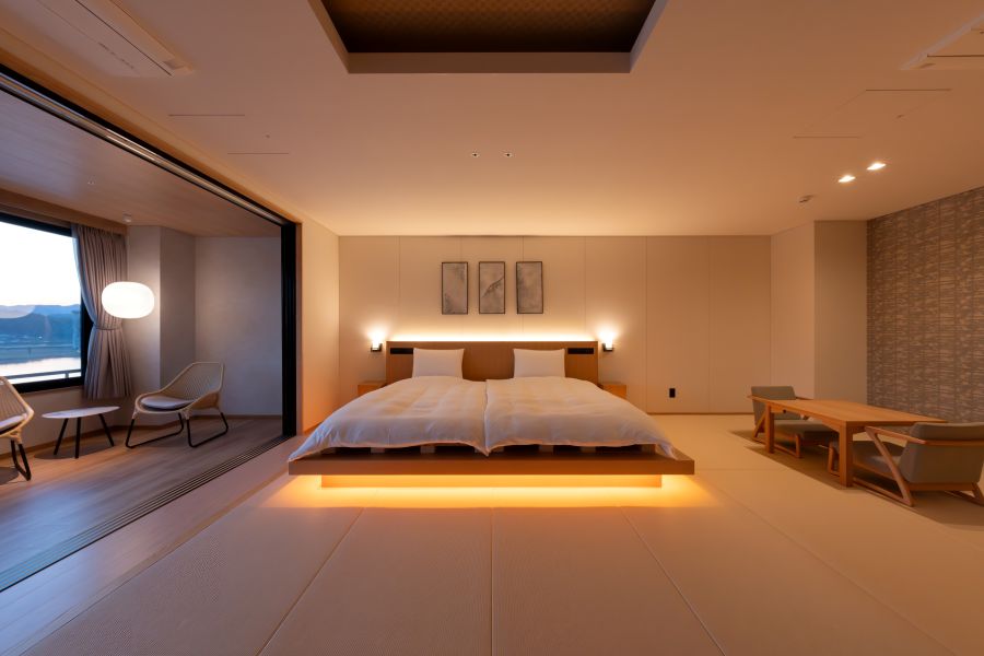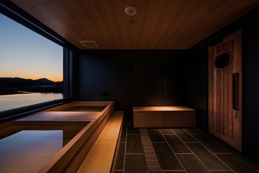 【福岡市内から1時間】全8室の客室は、サウナ・水風呂・温泉・ととのいスペースを備えた約70㎡のリバービューサウナスイート。水風呂の温度(16.5℃)や動線にもこだわり、サウナーに必要な設備を完備。客室サウナだからこそ、カップルで楽しんだり、写真を撮ったり、ベッドでととのったりと、自分たちだけの贅沢なサウナを楽しむことができます。サウナ後のお楽しみはサ飯。当館では、日本料理をベースにした懐石料理のサ飯をご用意。“サうな最中”、"ロウリュすき焼き"など、思わず笑みがこぼれ、ワクワクするメニューが並びます。一品一品が思い出に残る料理をお楽しみください。