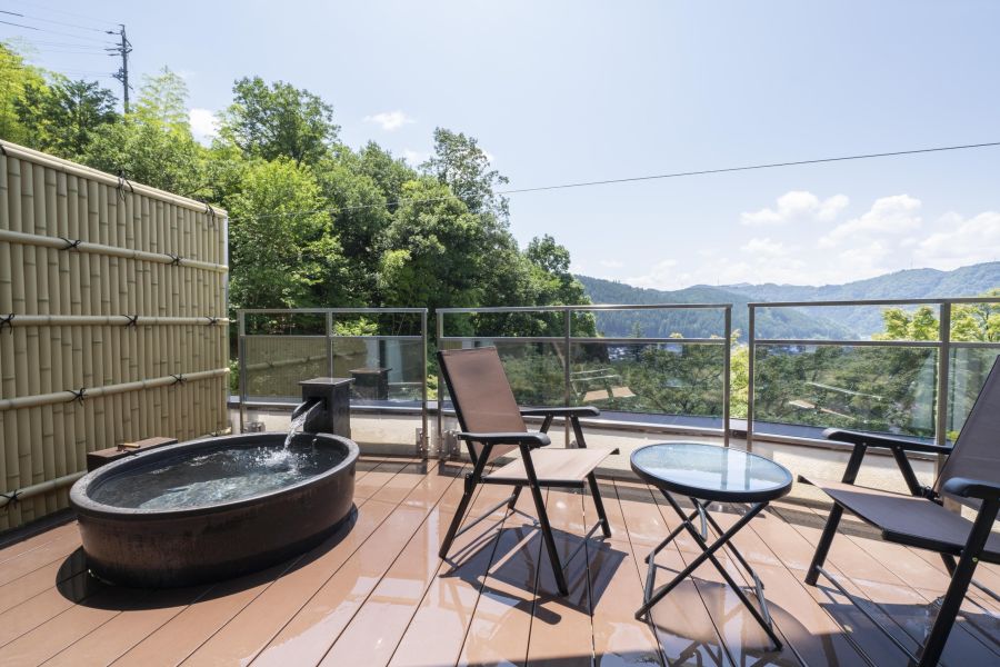 妻と一緒に郡上八幡を訪れた時に利用させていただきました。2階201の露天風呂付の部屋でとても広々としていてくつろげました。お風呂は176cmの私が目一杯足を伸ばせる大きさでとても気持ち良かったです。室内はとても清潔感があり設備も良くこちらの宿を選んで正解でした。レストランでは地元の主婦の皆さんが活躍されていてローカル色豊かで、スタッフの皆さんとの会話が弾み楽しかったです。 不満な点は夕食の鮎の塩焼きの焼きが不十分でベタベタして美味しくありませんでした。もっとしっかりと焼くべきです。朝食の鮭の塩焼きも、蒸しではなく直火焼きして出して欲しいですね。