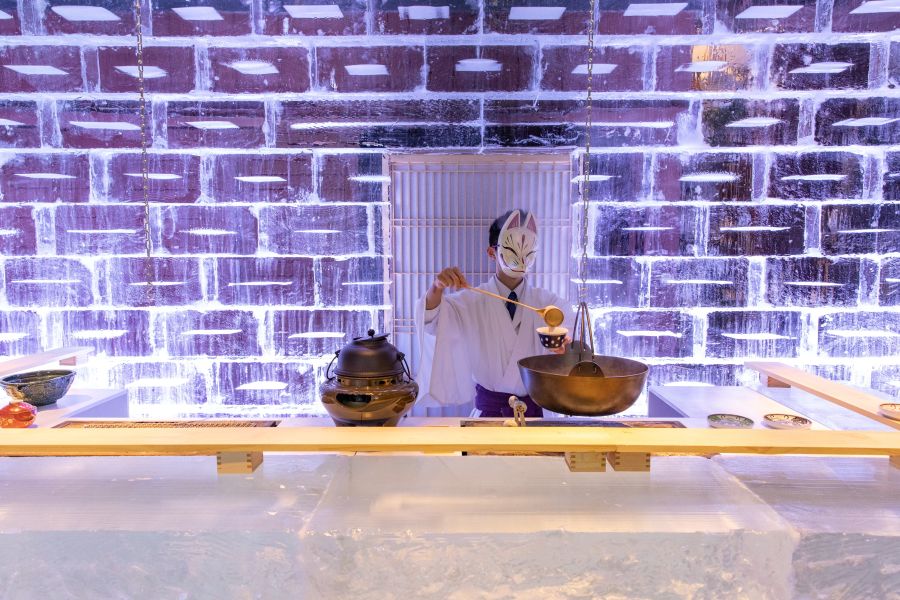 氷の家でのおもてなし、庭の雪景色は幻想的です。この年はフグ尽くしでお造りや唐揚げなどたっぷりいただきました。希少な百合根もほくほくで美味でした。環境を生かした素晴らしい演出とサービスはインスタで拝見した通りの美しさで、大満足な体験となりました。娘もプロジェクションマッピングのレストランにまた行きたい、と良き思い出になった様子にとても感謝しております。