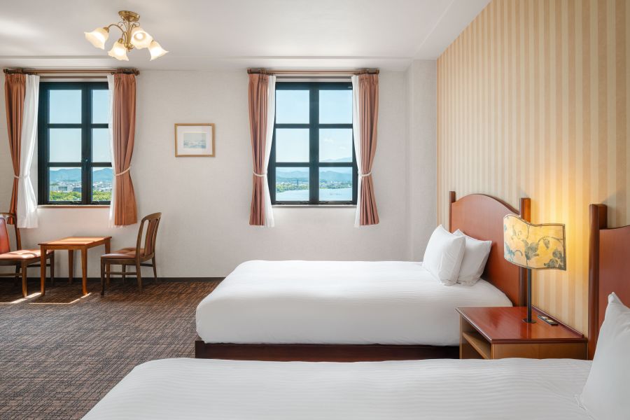 結婚式場に使われるホテルらしく、ロビーからおしゃれでしたしスタッフさんもきちんとしていました。部屋も壁紙などこだわりを感じるのですが、傷とか古さを感じる部分もありました。 目の前が琵琶湖で竹生島へのクルーズ乗り場も道挟んで向かい側にあります(徒歩15秒)。旅の目的が「琵琶湖が見たい」「竹生島行きたい」という人には良いと思います。 最寄りの長浜駅からは季節が良ければ歩けそうな距離ですが、電話すれば送迎もお願いできました。
