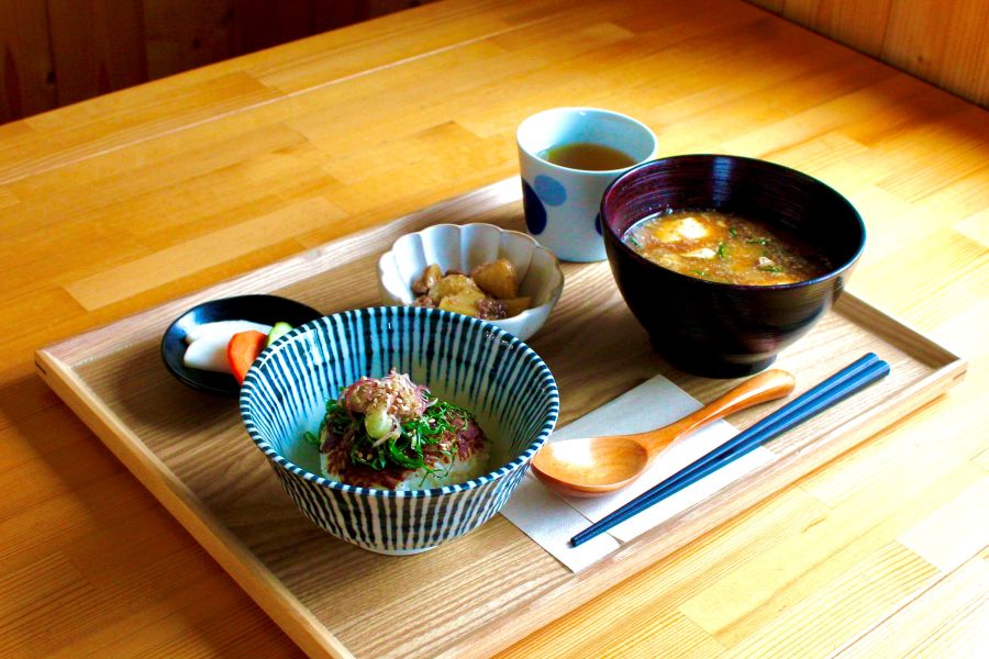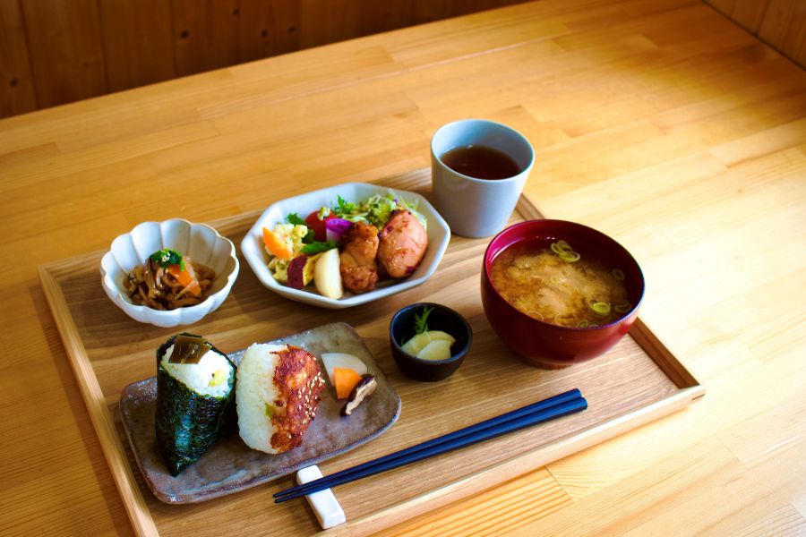 ランチは11時から。ここのお味噌汁が本当に優しい味でとてもおいしいです。おにぎりもおいしい!おにぎりは(梅、塩、昆布、鮭、味噌焼き)から二つ選べました。梅干しが酸っぱくてお米もおいしかったです。お店の中で自家製の梅干しやお味噌などが販売されていました。