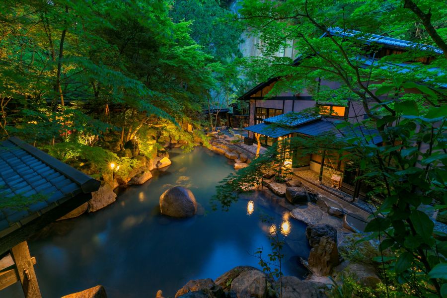 黒川の温泉街から少し離れ、静かな山間に囲まれた情緒ある宿「黒川荘」雄大な自然にすっぽりと包まれて美食に酔い、極上の湯に浸かる。四季折々、心ゆくまでごゆるりと。