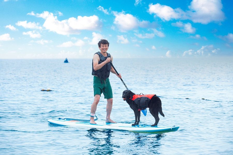 9月後半にDOGSUP体験会に参加しました! 9月後半は、まだ水温も温かくとても過ごしやすい気候でした。 初体験だったのですが、若い男性のトレーナーさんがとっても親切で、ひとりひとり丁寧に指導してくださり、愛犬も初めてのSUP体験にご満悦でした。 SUPに乗りながらスマホで臨場感溢れる写真をたくさん撮ってくださっており、とても楽しい時間を家族で過ごすことができました。 更衣室やシャワーの案内や、説明も非常にわかりやすく、わんちゃんのライフジャケット等のレンタルもあったので、手ぶらで参加出来たのが嬉しかったです。 最後に認定バッヂを発行していただけたので、来年の夏はプライベートで遊びに行きたいと思ってます。