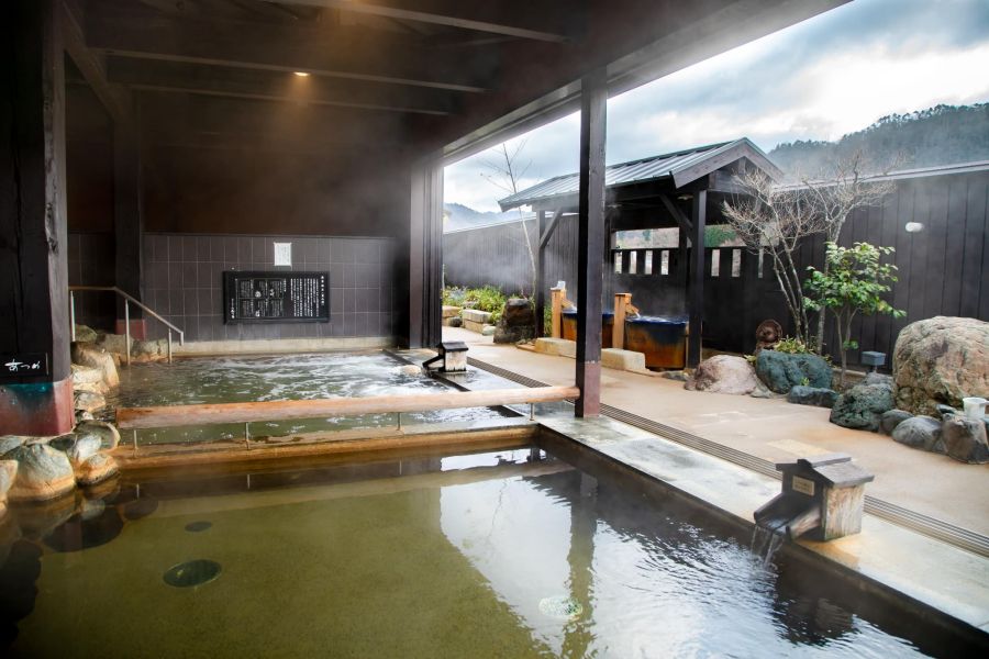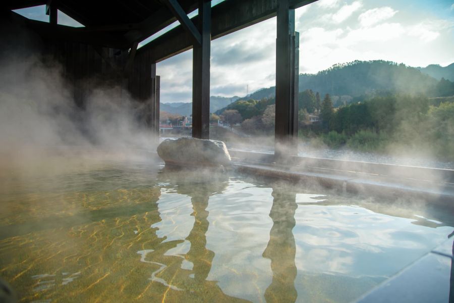 愛知川の自然が一望できる露天風呂を備えた宿泊施設。泉質は別名『美肌の湯』といわれる単純温泉。微弱黄、微弱水素臭、微塩味で刺激の少ない泉質でお子様からご年配の方まで入浴いただきやすい温泉です。五感すべてで四季を感じていただき、非日常を体験いただける施設です。
