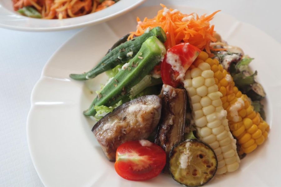 白いとうもろこし、モロヘイヤ、大豆にトマト、きゅうりやレタス、ポテトサラダなどなど野菜が盛り沢山の満足の前菜からスタート。万願寺唐辛子とトマトのパスタ、パスタの主張が少ない野菜がメインの美味しいパスタ。 最後は今まで食べたクレームビュリレで1番美味しいですね。大満足。