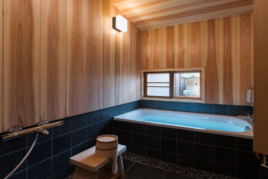 2階建て一棟貸しの松風庵。玄関を開けた瞬間思わず”ただいま”と言いたくなる空間。どこか懐かしい落ち着いた雰囲気のリビングは、安心感を与えてくれる。歩き疲れた体をそっと癒してくれるそんなお部屋。1階はリビング、2階は寝室とそれぞれの部屋に分かれているので中長期滞在にもおすすめ。キッチン、冷蔵庫、洗濯乾燥機も完備しています。暮らすように滞在する。それぞれの形にあったスタイルで自分らしい旅をすることができます。観光で思いっきり遊んだ日には、坪庭が見えるお風呂でゆっくり疲れを癒してください。心身共にリラックスタイム。京町家で歴史を感じながら、どこか懐かしい安心する雰囲気のお部屋です。床暖やエアコンは各部屋完備!
