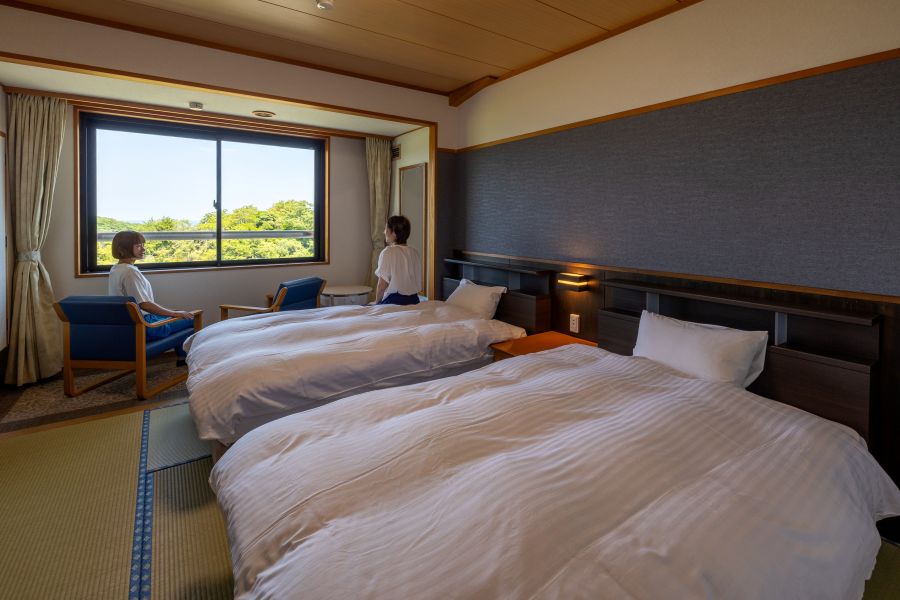 休暇村は比較的安く、品質の高いサービスが受けられるのでよく利用しています。 夕食はコース、朝食はビュッフェでどちらも美味しかったです。夕食はデザートビュッフェもあり、部屋に持ち帰って食べることもできます。朝食ビュッフェは海鮮系も多く、丼も小鉢サイズがあるので色々楽しめました。 部屋も綺麗で景観はどちらかというと山が多めですが、少し遠目に海も見えます。 お風呂は内湯と露天、サウナがあります。大きくはないですが綺麗でしたし、眺めも良かったので満足です。 最後に従業員の方々のサービスが良く、子供たちにも親切に対応頂けたのが良かったです。