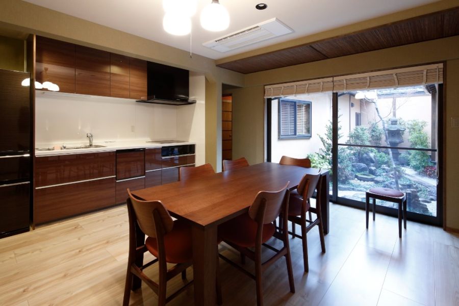 築100年以上の京町家をリノベーションし、現代と歴史ある部分の融合を楽しめる内装にしました。1階リビングには大きな坪庭があり、夜になるとライトアップされます。バスルームとトイレは1階と2階にそれぞれあり、寝室は3部屋、最大8名様までお泊り頂けます。大人数でも不自由なく快適にお過ごし頂けます。1階に洋室(シングルベッド2台)と2階に和室2部屋(大/小)とございます。和室はお布団のご用意となります。広々とした町家をご自宅のようにくつろげる空間に仕上げました。あなたの京都旅行をもっと、京都らしく。お子様がいるご家族も大歓迎!我が家の感覚でくつろぐことができます。みんなでわいわい楽しく過ごすのも良し、しっぽりとした時間を過ごすのも良し!自分たちのスタイルでお楽しみください。