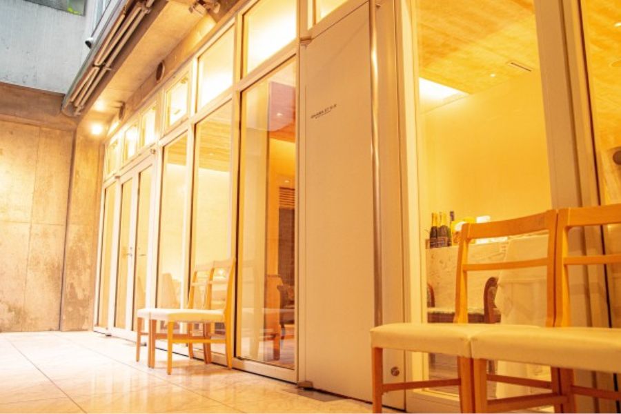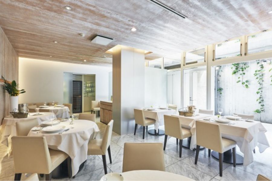 西麻布の閑静な住宅街にあるモダンなビル。その階段を降りるとそこには異空間が広がります。「無機質な清潔感」をコンセプトにしたクールな店内。昼は吹き抜けのテラスに太陽がふりそそぎ、夜は間接照明の温かみがくつろぎを演出する。そして開放感のある店内に人と料理が鮮やかに彩られて、ゆったりとながれる大人の時間の中、温かいサービスと素材の存在感を大切にした繊細な料理をお楽しみください。同窓会やご家族など、大切なお集まりに利用していただけると満足いただけると思います。