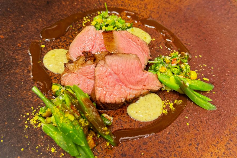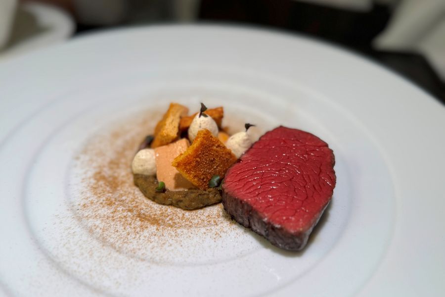 “シェフからのお口始めの一品”から始まり、季節感溢れる食材でひと皿ひと皿丁寧に構成された流れが印象的でした。軽やかに食欲を引き立てるひとくち達。コース全体の導入としてワクワクが高まりまた。 1つめの前菜には仔牛・竹の子・紅茶。 柔らかな仔牛と春らしい竹の子が、ほんのり紅茶風味の余韻とマッチ。優しい香りが口の中にふんわり広がり、季節感を演出してくれます。 2つめの前菜はフォアグラ・大根。 濃厚なフォアグラを大根がさっぱり受け止め、バランス感が素晴らしい一皿。重さを感じさせず、でも満足感がある絶妙な組み合わせでした。 メインの肉料理には鴨・ホワイトアスパラ。(友人は和牛を選んだので和牛の写真も載せました。) 控えめだけど鴨らしい癖も感じつつ、程よい歯ごたえがたまらなく美味しい。ホワイトアスパラの甘みがじんわり寄り添い、口の中で春の野菜を感じられました。 デザートには写真映えする薔薇のボックスにひとくちドリンク。華やかな香りと共に女性心をくすぐってきます!笑 店内は落ち着いた照明と上品な卓上セッティングで、静かに会話を楽しめる空間。 記念日や特別なお食事に、是非また使いたいと思いました。