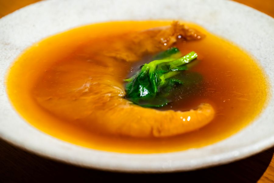 【2025年8月、訪問】 この日は評判の中華に伺おうとこちらに。 週末の夜、広尾からプラプラと歩いて行くと、とんかつで有名な「西麻布 豚組」の隣の静かなエリアにお店はありました。 周辺にもチラホラとお店があり、きっと私の知らない名店もたくさんあるのでしょう。 店内に入ると西麻布らしいオシャレな内装であり、広めにとられたスペースに座りやすい椅子が用意されていました。 ラッパ系ジャズだったり、シャンソン風だったりとBGMも雰囲気に合っています。 こちらのシェフはホテルオークラで修業されたという木村氏。 まだお若いのですが、緩急をつけた味付けや火通しの巧みさに経験の豊富さを感じました。 この日は一番人気だという「禾-NOGI-コース」を。 せっかちに食べる私たちに合わせて料理もテンポ良く出して頂き、あっという間にコースを完食、コースだけでも十分なボリュームだったのですがデザートも追加して楽しみ切りました。 料理は日本人の好きな中華を体現したような構成と味わいであり、それぞれのお皿が記憶に残りました。 旨い料理はもちろん、近くの方がフラリと立ち寄るような肩肘張らない雰囲気造りも含めて居心地の良いお店でしたよ。 ■禾-NOGI-コース 11,000円 (税込み) ・前菜3種盛り合わせ ・蟹肉とフカヒレのスープ ・北京ダック ・南乳叉焼 ・天然海老の強火炒め ・鮮魚の中国風香味蒸し ・ラムの重慶炒め ・蟹肉とレタスの炒飯 (追加) ・杏仁豆腐 カラメル 600円 ・とろけるカスタード饅頭 450円 ■飲んだモノ ・生ビール 晴れ風 850円 x2 ・紹興酒ソーダ割 1,000円 x2 ---- なにはともあれ「生ビール」で乾杯。 「晴れ風」は柑橘系の風味があり、中華にも合うチョイスかと思います。 「前菜3種盛り合わせ」は「焼き茄子の青ネギソース」「クラゲの冷菜」「棒棒鶏」が登場。 「焼き茄子」の火も入っているという青ネギソースの甘さ、「クラゲ」らしい食感、そして「棒棒鶏」の濃厚なソースとナッツのカリっと感がそれぞれ良き。 特に「棒棒鶏」のソースはビールを誘うモノでした。 「蟹肉とフカヒレのスープ」は熱々で登場。 一口食べると、蟹肉のサイズ感と合うようにフカヒレがほぐされており、滋味あふれるスープと食感の両方が味わえます。 お店に入ってクールダウンしてきたタイミングでもあり、夏に熱いスープが体を元気にしてくれました。 「北京ダック」はリンゴが入っているのが特徴。 果実と甜麺醤(中華味噌)のバランスされた甘さが良く、リンゴならではのシャクシャク食感も面白いです。 私はこんな「北京ダック」は初めてであり、リンゴ入れて良いのね…!、という驚きがありました。 焼き立ての「南乳叉焼」はとろけるようなチャーシューの脂と絶妙なタレが秀逸。 この旨みが溢れる脂をザーサイですくうようにして一緒に食べて行きました。 豚はいろんな旨みを秘めていますが、ここまで引き出せる調理法はなかなかないように思います。 軽快な鍋サウンドの後に登場した「天然海老の強火炒め」は木村氏の火通しの技が光るモノ。 天然海老、アワビダケ、アスパラ、ヤングコーン、冬瓜、ネギなどが油を纏ってそれぞれが居場所を確保しているような感じに。 パンッと弾けるような海老の食感だけでなく、それぞれの野菜の旨さを丁寧に味わいました。 こりゃ旨い。 「鮮魚の中国風香味蒸し」のこの日の「鮮魚」はマハタであり、クエのような強めの食感を持っていました。 この白身魚の味わいを引きだすために濃いめのタレを用いておりこの2つを合わせてちょうどになるようなバランス。 マハタのプリンとした食感を存分に活かしたような香味蒸しでした。 「ラムの重慶炒め」も面白い一皿であり、ラム肉の個性を唐辛子や山椒の風味が受け止めます。 ラム肉から溢れる脂がポテトに染み出すのも良く、ポテトだけ食べても旨いような料理に。 中国では当たり前のように羊を食べていることもあり、ラム肉の力を引き出すのもさすがだと感心しました。 コースとしての〆の「蟹肉とレタスの炒飯」は「さっぱり」ではなく「しっかり」とした味付け。 こちらのコースであれば「さっぱり」は向いていないので、納得感のある「しっかり」さでした。 最後までお酒にも良く合いましたし。 コース内容だけでも満腹にはなっていたのですが、この美味しさならきっと間違いないだろうとデザートも追加。 「杏仁豆腐 カラメル」はプリンのようなルックスですが、餡はもちろん杏仁豆腐であり滑らかな舌触りを楽しみます。 「とろけるカスタード饅頭」は事前に言われてなかったらきっと手にべっとりついたであろうと思えるくらいに、たっぷりのカスタードクリームが饅頭から溢れ出します。 木村氏も甘いモノがお好きだということでしたが、どちらもこちらのコースの〆に相応しいしっかりとした甘さでした。 しっかり食べて飲んで。 こちらは西麻布の地にありながら、私たちの早いテンポに合わせてくれたりと肩肘張らないスタイ