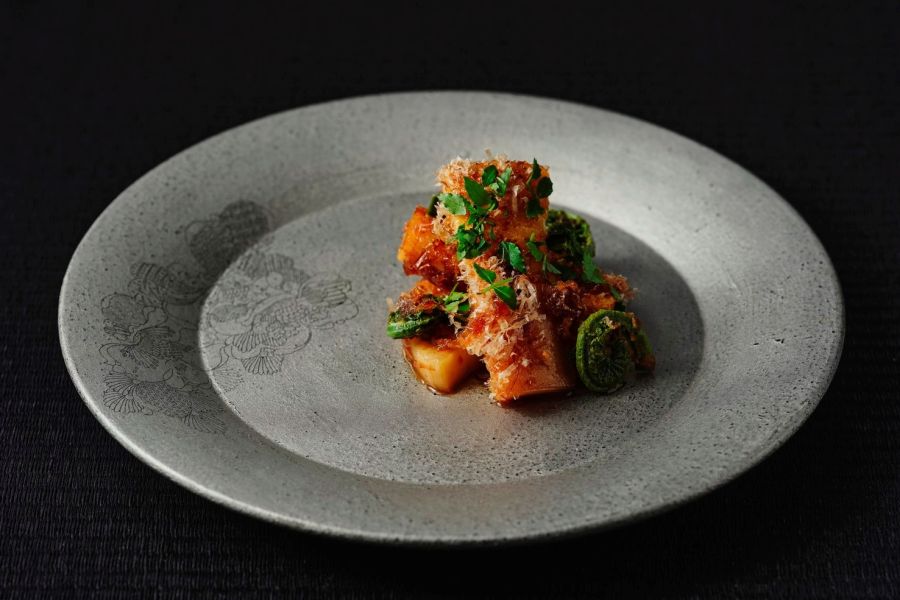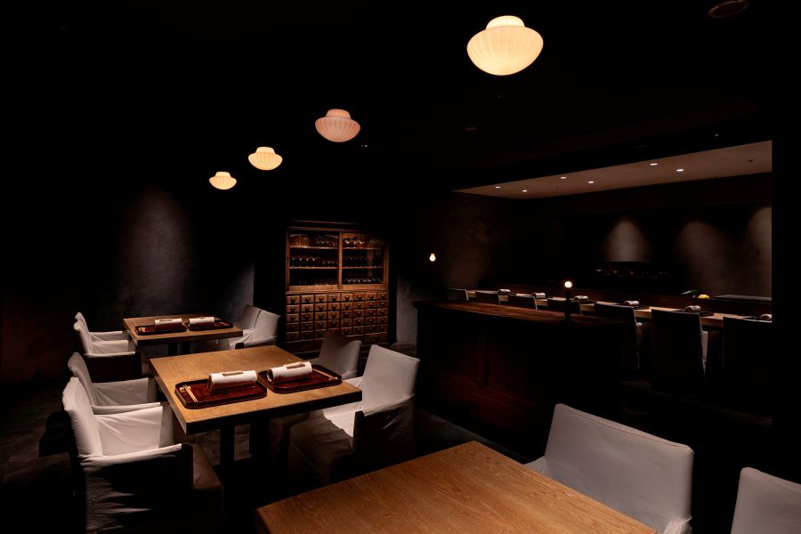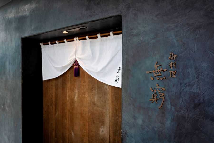 「無窮(むきゅう)」──「限りがないこと」「終わりなきもの」を意味し、禅語「天壌無窮」にも通じる、普遍性と時間軸を超えた価値観を内包する⾔葉です。店主が京都「未在」で学んだ「未だ在らず(=修⾏に終わりなし)」の哲学を継承。その終わりなき探求の精神を、⾃⾝の料理⼈⽣に重ね合わせ「無窮」と名付けました。季節ごとの⾷材の“今”を丁寧に映し出す⼀⽫で構成されています。伝統的な技法を重んじながらも、その⽇に仕⼊れた⾷材の声に⽿を澄ませ、薪⽕や器との調和を⼤切に仕上げる──。移ろいゆく⽇本の四季を五感で味わう、⼀期⼀会の⾷体験を提供いたします。