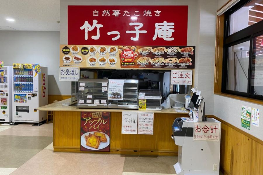 青森県と秋田県の県境国道七号線沿いの藩政時代の庄屋屋敷を模した建物の、道の駅いかりがせき内のたこ焼き屋、竹っ子庵(たけっこあん)。碇ケ関の特産品の自然薯を生地に練り込んだ自然薯たこ焼きが人気。味などいろんなバリエーションがあります。アップルパイやマルメロパイなどスイーツも取り扱い、ほかにテイクアウトメニューもございます。