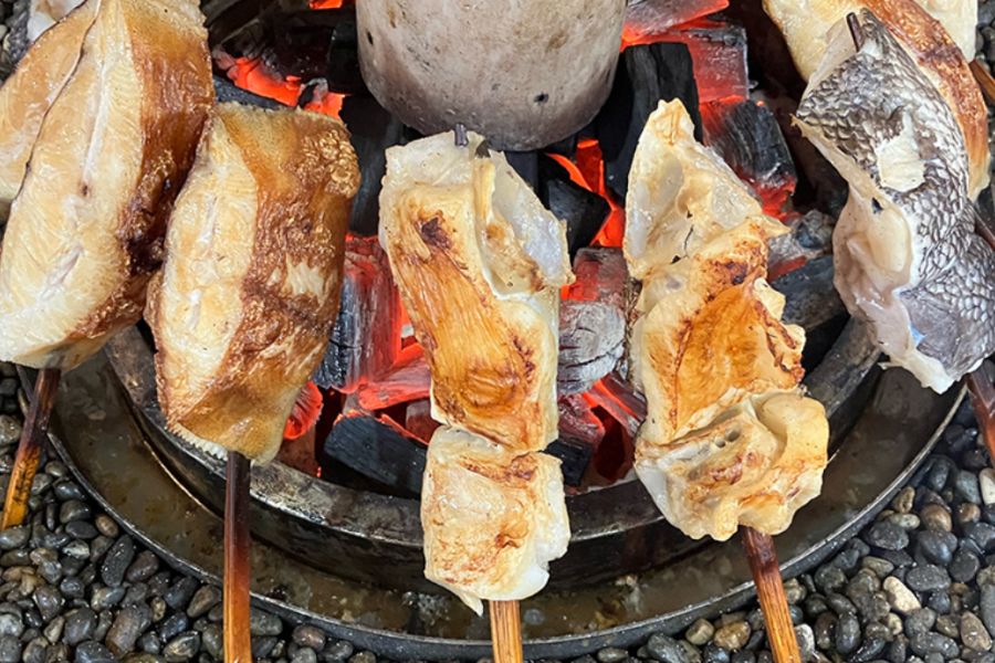 八戸屋台村みろく横丁。お魚や野菜を炭火で焼いています! 焼きたてのお魚をつまみに日本酒などを飲んでみませんか!