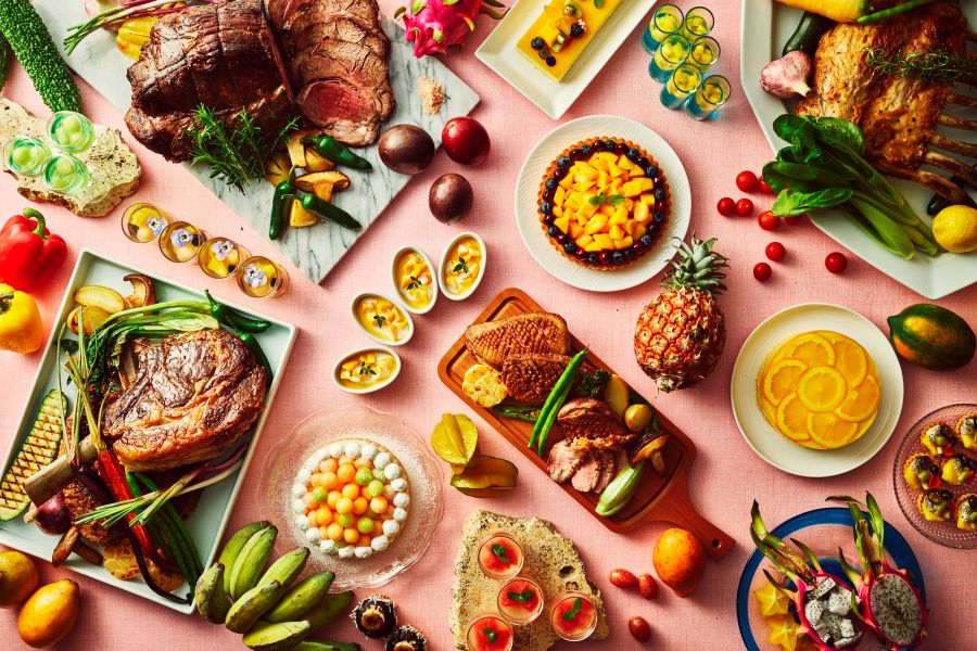 万座毛を臨む美しい景観とガーデンプールを背景に、豊富なインターナショナル料理セレクションをブッフェスタイルでゆっくりお楽しみください。