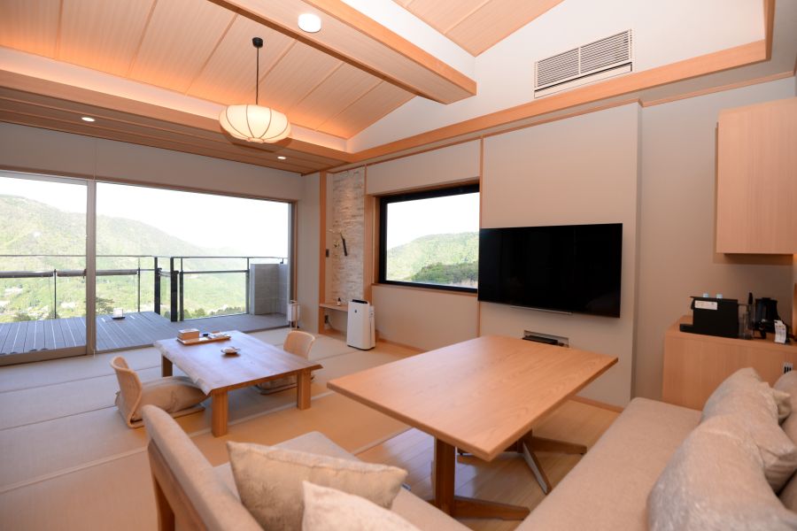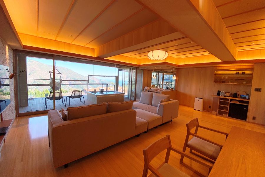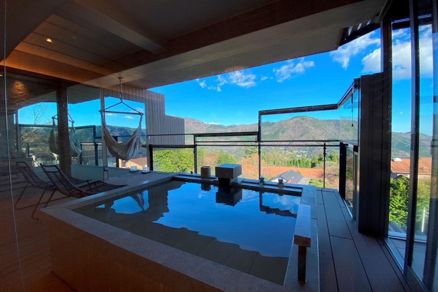 最上階角部屋に一泊しました。 明星ヶ岳、相模湾を臨む眺望、空に浮かんでいるような広いバルコニーの開放感に思わず声が出ました。バルコニーの露天風呂に浸かりながら、絶え間なく聞こえてくる野鳥の鳴き声に耳を澄まし、深くリラックスできました。 明るくシンプルでモダンな和洋室も、重厚な和風建築が苦手な私たちには大満足でした。 コーヒーマシンだけでなく、グラス類や茶器も素敵でしたし、宿オリジナルの玄米ハーブティーやお菓子、冷蔵庫の中にはビールやウーロン茶のほか、フルーツゼリーまで無料でした。 お部屋の中のシャワーブースで体を洗ってからそのままバルコニーに出てすぐ露天風呂に入れる動線が凄く良かったです。真上から雨のように浴びられる珍しい大型シャワーヘッドと、リファのシャワーヘッドの2つがあったのも嬉しかったです。 到着の出迎え、チェックイン時のお茶とお菓子のふるまい、部屋での夕朝食のお世話の全てにおいて、若いスタッフの皆さんが笑顔を絶やさず、一生懸命もてなそうとしてくださる姿が、本当に気持ちよかったです。お部屋担当のNさんの接客が特に素晴らしくて、感動しました。 お料理も創意工夫が尽くされ、美しく美味しく、楽しくいだきました。 ロビーのドリンクサービスも種類が豊富で選ぶのが大変な程でした。 夜中にロビーに降りてきたら、誰もいない静かなフロアに、虫かごの鈴虫の声が響き渡っていて、本当に素敵でした。おいしいコーヒーを飲みながら秋の雰囲気を一人で満喫しました。 お部屋には星空を楽しむための星座早見表、双眼鏡が用意されていましたが、曇りで星は見えず。ぜひまた星空を見に来たいと思いました。 夫の誕生日祝いの旅行だったので、直前に電話でお願いしたら、快く夕食のデザートをバースデープレートに仕立て、ドリンクサービスもしていただきました。 若くも旅慣れてもおらず、箱根は初めてだったのですが、人気観光地で喧騒だろうと思っていた箱根で、こんなに静かで豊かな時間を過ごせるとは。 一泊ではもったいなかった。つぎは連泊してもっと癒やされたいです。 改善点をあげるとすれば、 洗面所がオープンなので、いつも目に入るのが残念でした。パーテーションかブラインドなどがあれば、さらに居心地が良くなると思います。またウエブサイトの情報が少なく、この宿の良さが伝えきれていないと思いました。特にお部屋で受けられる指圧についてはウエブサイト上に案内がなかったのが残念でした。