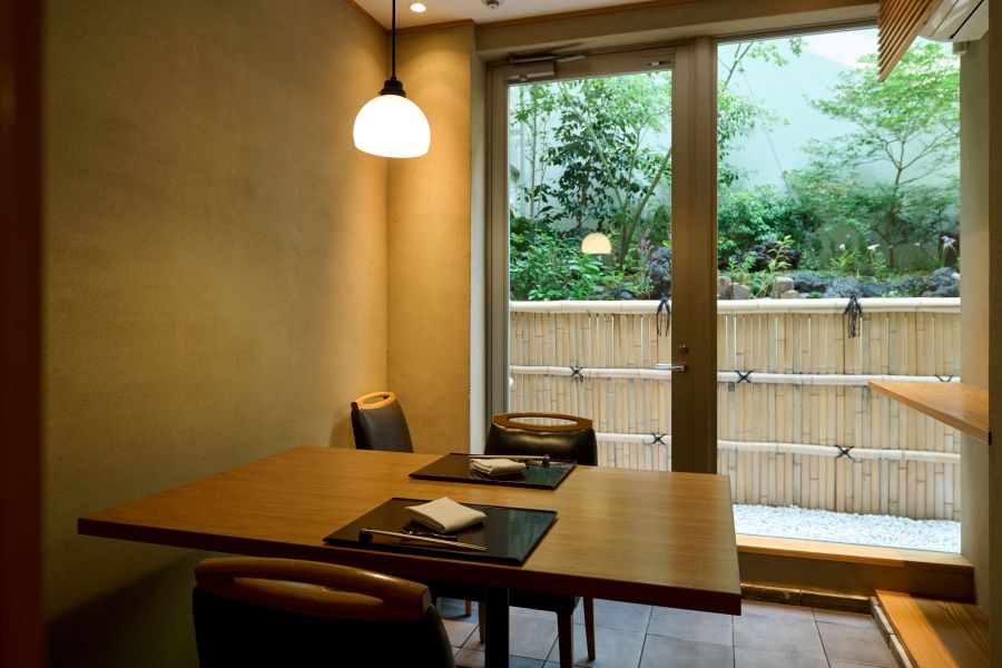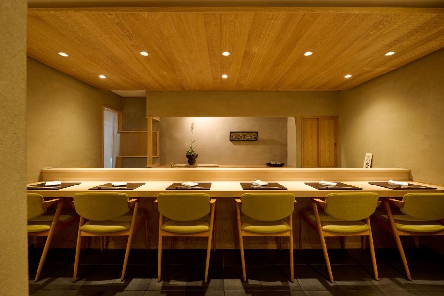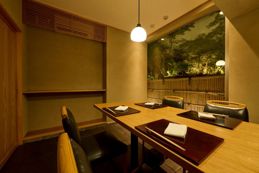 数寄屋風の店内には、木曽檜のカウンターと8名様/4名様対応の完全個室を完備しています。木のぬくもりと季節のお花に心が安らぐ空間で、旬の食材をふんだんに使った日本料理をお楽しみいただけます。店主の技が活かされた端正なお料理は、接待やご友人・ご家族とのお食事、お祝い事に最適です。