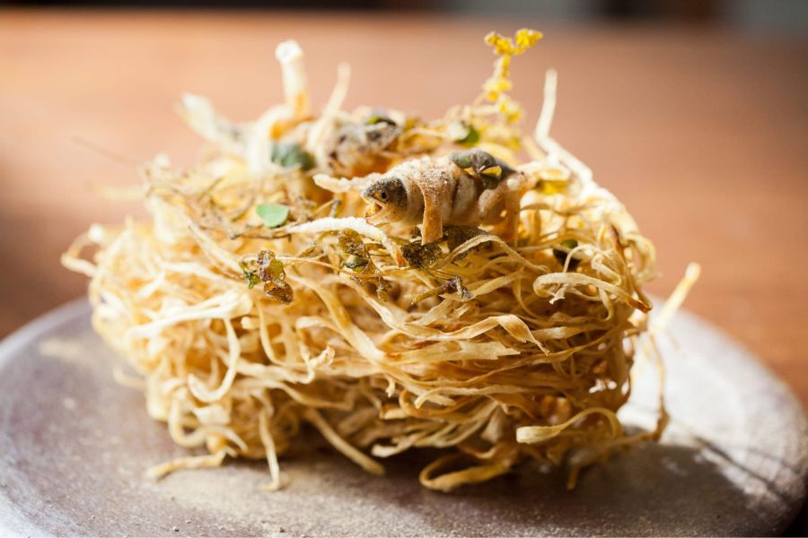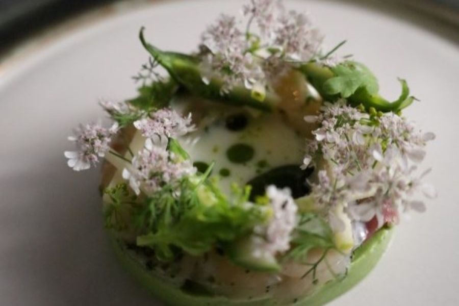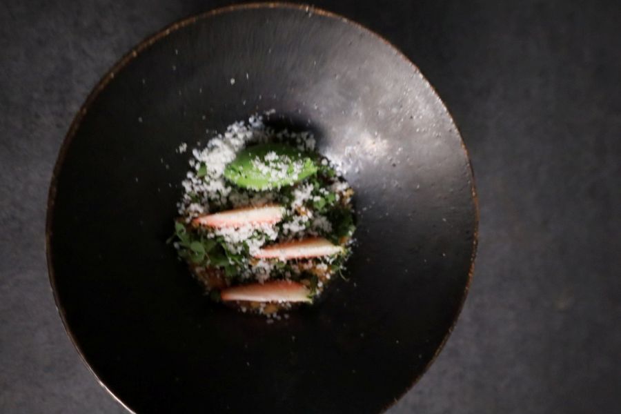 独創的なお料理が多く、フォアグラのテリーヌはまるで本物の薔薇のようで圧倒的な美しさでした。 薔薇のお料理は1テーブル1皿のみの提供で 代わりのお料理はパテアンクルートになります。 〜order 〜 ・ランチフルコース ¥10,780 ・ノンアルスパークリング ・ミネラルウォーター 〜感想〜 メニューがないので終始ワクワクでした フィンガーフード2品からスタート✨ 1品目は「原木椎茸のタルト」 ほんのり甘くてまるでスイーツみたい! 2品目の「青さのチップス」 パリパリと食感が良く 雲丹の甘みと香りが 口いっぱいに広がって幸せ〜♡ ムール貝とパプリカの一皿は 見た目が鮮やかで美しい黄色が印象的 スパイシーなペーストがアクセント⚡ お次は「そば粉のクレープ」 鯖、イチジク、おかひじき、クレソン、さらにシェーブルチーズも入っていました! シェーブルは苦手なので恐る恐る食べてみたら… 驚きの美味しさ! 鯖も臭みゼロで全体のバランスも良かったです❤ スープは、かぼちゃのポタージュに 車海老のラビオリが入っていました アーモンドが香るエスプーマがふんわり〜 焼きたてのカンパーニュはかなり大きい!! 外はカリッと中はモチッと絶品 そしてお目当ての薔薇のお料理が登場! 本物の薔薇のような美しい見た目に感動 土台はフォアグラのテリーヌで濃厚クリーミー 花びら部分はビーツのチップスでほんのり甘く パリパリの食感が楽しめました。 パテアンクルートは軽やかな仕上がりで、 重たくなりがちなパテが驚くほど食べやすい✨ お魚料理は、甘鯛を鱗ごとパリッと焼き上げた一皿で、2色のソースが添えられていて見た目も可愛かったです 最後は鹿肉のロースト。 しんしん、ともさんかくの2部位が提供され ともさんかくは脂が多めなのに重たさゼロ! 鹿肉特有のクセもなくジューシーで 柔らかく仕上がっていました。 モンブランは濃厚で滑らかなクリームと 土台のサクサク感がたまらない美味しさ 最後はしっとりとしたミルクレープと 香りの良い紅茶で締めくくり✨ 最後まで飽きさせない構成で 大満足のランチでした