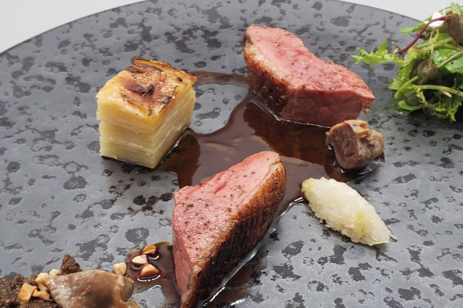 お気に入りのレストラン☺️ 『ミシュランガイド』にて9年連続で一つ星の白金台にある素敵な一軒家フレンチレストラン🍴 路地裏の静かな場所にある大人の隠れ家な雰囲気 四季折々の厳選された食材をシェフの創造性豊かなインスピレーションを基に、クラシックでありながらどこかアーティスティックな印象を与える本物のフランス料理をコース料理で提供 フランス料理らしい力強さやボリューム感を大切にしながら、油脂分を控えて素材の持ち味を生かすのがシェフのスタイルだそうです。 旬の食材を使い、妥協がなく手間暇かけた美味しい料理を提供していただけます。 店内はコンパクトな落ち着いた空間でアットホームな雰囲気で肩の力を抜いてフレンチを楽しめます。 いただいたのは 『ディナー ムニュ ルカンケ』 ルカンケの名を冠したディナーのスタンダートコース 11品16,800円 季節の食材を厳選したルカンケの全てを楽しめるコースです。 【メニューの内容】 小石と葉 フォアグラ サプレ サスティナブル ムール貝 トマト 大業 鱧 松茸 きのこのラグー 鮎 蓼 タブレ 鮑 キャビア 平目 黒豆 トリュフ 蝦夷鹿 ムサカ 桃 フランボワーズ ヌガーグラッセ 食後のお飲み物 お茶菓子 メニューからどんなお料理がでてくるかワクワク フレンチですが和の食材を取り入れたイノーべティブなお料理 ♦︎ 小石と葉 本物そっくりな小石と葉っぱの形をした一口アミューズ。探しながら食べるのも楽しい☺️ 小石は竹炭を練り込んだ豚リエット 葉っぱはノンフライポテト 本物の小石と葉っぱと見分けがつかないくらいでした ♦︎ フォアグラ サプレ 美しいフォアグラのテリーヌ メープルシロップジュレ、下にはサブレ 甘くて濃厚なフォアグラのサブレでした。 ♦︎ サスティナブル 規格外の野菜を使った3品 ✴︎一つ目はおしゃれなタコス ✴︎ケールを使ったタコスにシシカバブを巻いていただきました。 ✴︎スープ いろんなお肉の端材やお野菜の端材を使った身体にも優しいスープ ✴︎モンサンミッシェルの牡蠣 大粒の牡蠣に牡蠣のお出汁。下にはカッペリーニ ♦︎ 鱧 松茸 きのこのラグー 旬の松茸やきのこたっぷり! 細かく薄切りの松茸が凄い!香りもとてもいい 下には淡路島の鱧 鱧のお出汁でとったスープもあっさり 器も素敵 福井県の鯖江の伝統工芸の器だそうです。 ♦︎鮎 蓼 タブレ 鮎の下にきゅうりやクスクス 蓼酢をおしゃれに泡に ♦︎鮑 柔らかく煮込まれた鮑に濃厚な鮑の肝ソース 贅沢な一品 ♦︎ 平目 黒豆 トリュフ レアに焼いた平目と発芽玄米黒米 添えてあるのは大葉、山芋のピクルス 佐賀県唐津のながひじき、新生姜、三葉 その上には贅沢に黒トリュフかけていただきました。香りもとってもいい! 仕上げにカツオと昆布のお出汁でとったブイヨン いろんな味が口の中でマリアージュ ♦︎ 蝦夷鹿 ムサカ ダッチオープンにに入った藁焼きの鹿🦌 美しいピンク色のお肉🥩 藁焼きした鹿がとても柔らかくてジューシー 藁焼きしてるので藁の香りも香ばしい 鹿料理にあうポワヴラードソース 胡椒やフランボワーズを使った濃厚なソースはシカと相性抜群 添えてあるのはスーパーフードのつるむらさき まん丸なものはブータンノーワールのフリット ムサカ添え ギリシャの郷土料理でラザニアのようなお料理 蒸したさつまいもやナスを使ったムサカ 一つ目のデザートは ♦︎桃とフランボワーズのムース 桃のコンポートジュレ 桃とヨーグルトのエスプーマ メインのデザートは ♦︎ヌガークラッセ バナナ風味アイス添え バーベナのメレンゲ、その上にはカフェラテのシート 上から液体窒素で固めたエスプレッソのアイス モクモクの演出も楽しい ♦︎カフェと一緒に小菓子 切り株に乗ったカヌレとキノコの形のフィナンシェ これも可愛い😍 王道のフレンチというより和の食材をたくさん取り入れているイノベーティブなフレンチ 少量多種でいろんな味が楽しめました どのお料理も美味して大満足 フレンチましてやミシュランの星レストランというと構えてしまうところがありますが、こちらのお店は普段使いから接待まで肩肘張らずに使える気楽なお店です。 女子会やデートにもおすすめなお店です👍