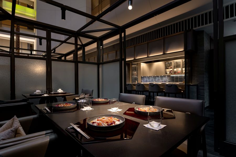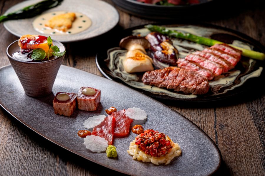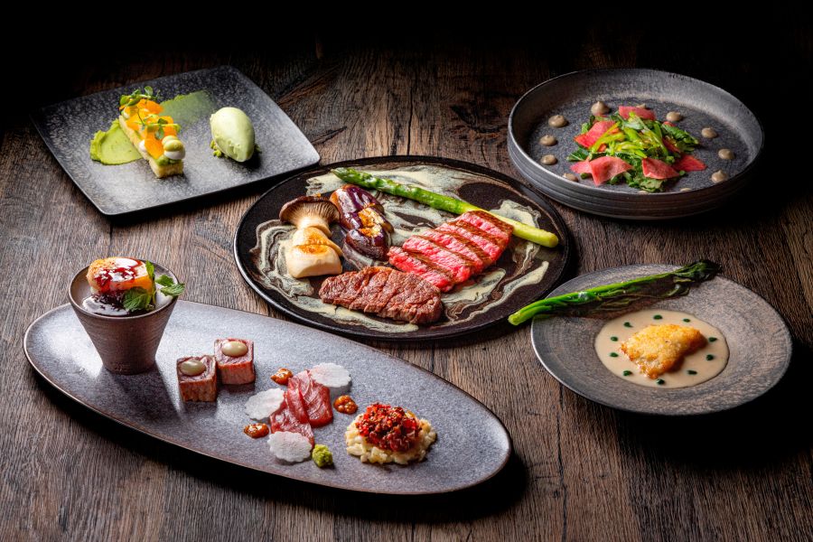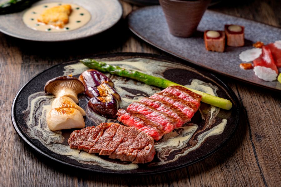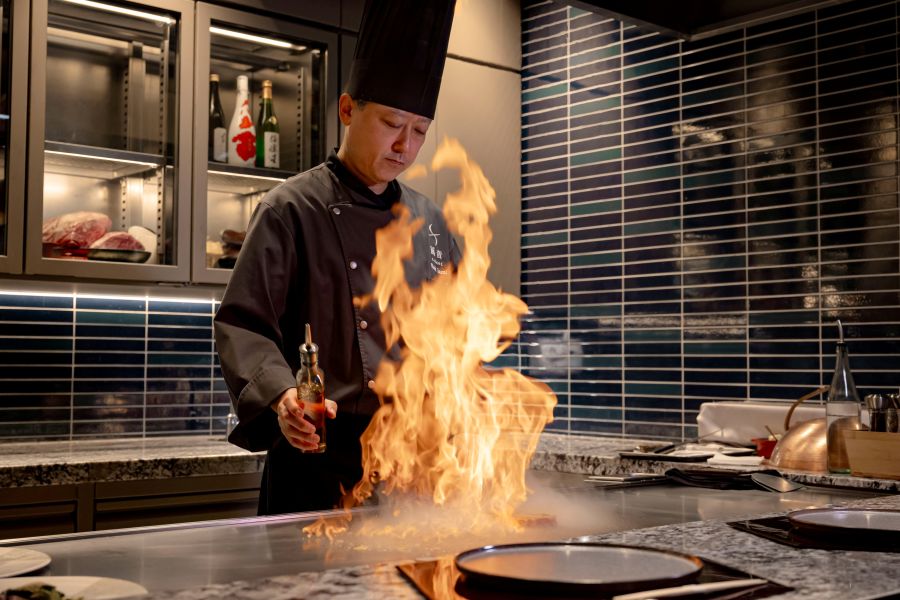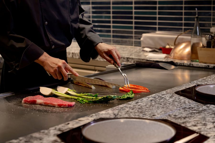 職人の技を目の前で堪能しながら、選び抜いた銘柄牛と山の幸、海の幸を楽しめる鉄板焼「風音(かざね)」。アトリウムの中央、「リュトモス」と「メロディア」の奥に位置し、リズム、メロディ、ハーモニーの3つの要素が融合した美しい音楽に、鉄板の上で食材を焼く音や立ちのぼる香りが風格を加えます。歌舞伎の下座音楽にもある「風音(かざおと)」をヒントに、音色のバリエーションや変化を、歌舞伎や雅楽の伝統的な舞台構成である「序破急」と捉え、3 種類の鉄板焼のコース料理をご用意しています。カウンター越しにシェフとの会話を楽しむ贅沢な空間です。