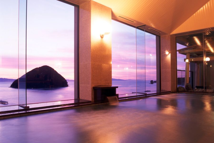 海沿い温泉旅館です。泊まった部屋からは湯の島ごしの夕日が見えてよかったです。温泉も大きくてよかったです。ご飯もバイキングで色々な思考をこらした料理がとても美味しくて楽しかったです。夜は三味線の演奏もありラウンジでは地元のお酒やジュースなどが自由に飲めて本当に楽しかったです。