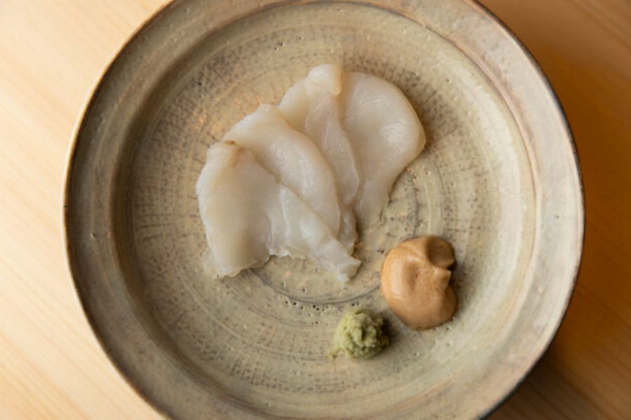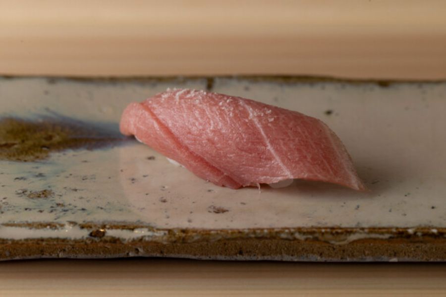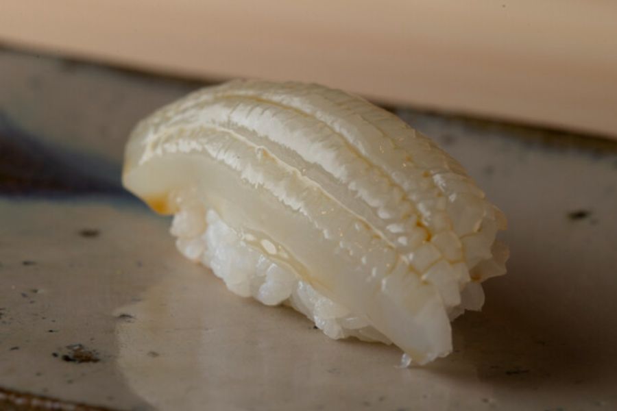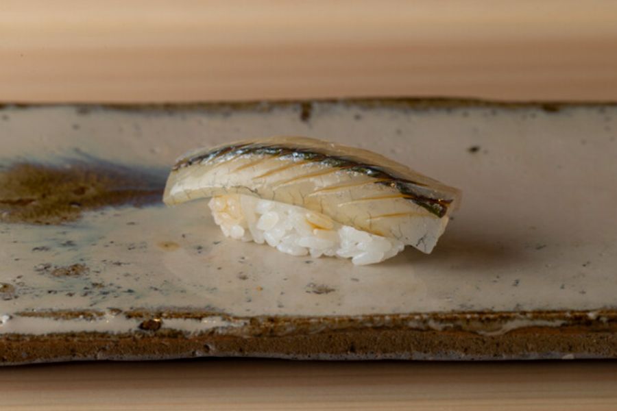 麻布十番1番出口から徒歩3分程度、新めのビルに入ってるお寿司屋さんで今年の春オープンの新店です。 銀座の青空に長くいらっしゃってその後鮨祥を西麻布でやられてました。 そして独立オープンになります。 平日の夜に予約して訪問。 メインカウンターと、個室のサブカウンターがあります。フルでお客さん入ったとしたらどちらも大将が握るみたい。 メインカウンターはカクカクのちょっと角度ついたタイプのやつ。内装に結構力入れたようでかっこいいです。 おまかせコースは27,500円。 つまみ6品と握り11カン、玉、デザート あと間にお口直しの湯葉とお椀が出た。 つまみはシンプルなものからお料理っぽい手が込んだものまであって嬉しい。そしてどれも美味しい。 初松茸もいただきました。 握りは、ちょい硬めのしっかりと握られた感じの白シャリ。ほぐれ悪いってわけではないです。 お酢と塩もキリッと効いてるけど、青空さん出身だからといってそこまで強すぎないのがありがたいです。 ナガスクジラの脂乗ってて美味しかったのと、めちゃクリアな甘みのあるホッキ貝が印象的でした。 場所と内容考えたら今の値段はまだまだお値打ちなので早めに行った方がいいかも。