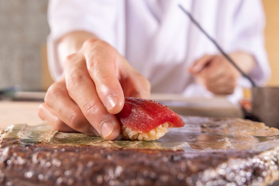 白金高輪の住宅街にひっそり佇む「鮨 無何有」。瀟洒な空間で若き大将が真摯な所作と研ぎ澄まされた感性で紡ぐ鮨は、肩肘張らずに味わえる一貫です。漁師直結で仕入れる旬魚は血抜きや神経〆を施し、旨みを最大限に引き出します。季節の恵みを握りや一品料理で織り交ぜ、鮨の魅力を余すことなくお届けします。