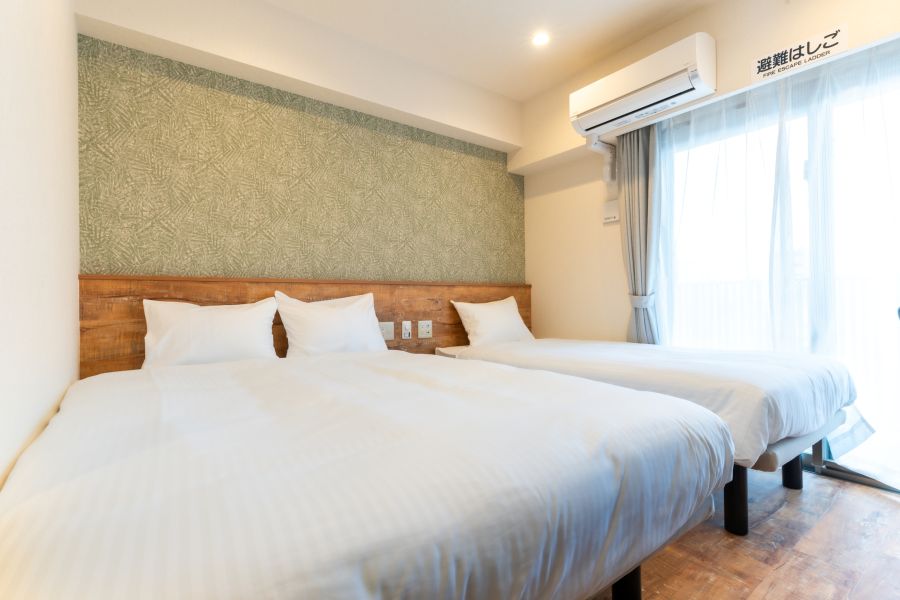 ゆいレール県庁前駅より徒歩4分の場所に立地!全室ツインルーム(ダブルベッド1台・シングルベッド1台)、冷蔵庫、電子レンジ、洗濯機、ガス乾燥機を完備。飲食に買い物に便利な国際通りや、沖縄一繁華街、那覇市松山までそれぞれ徒歩5分圏内と、観光にビジネスにベストロケーションです。