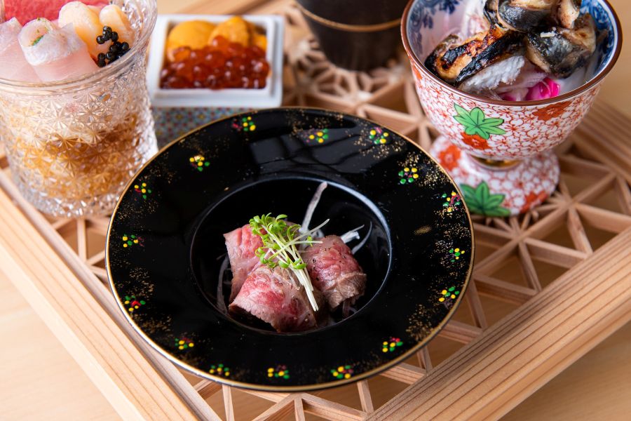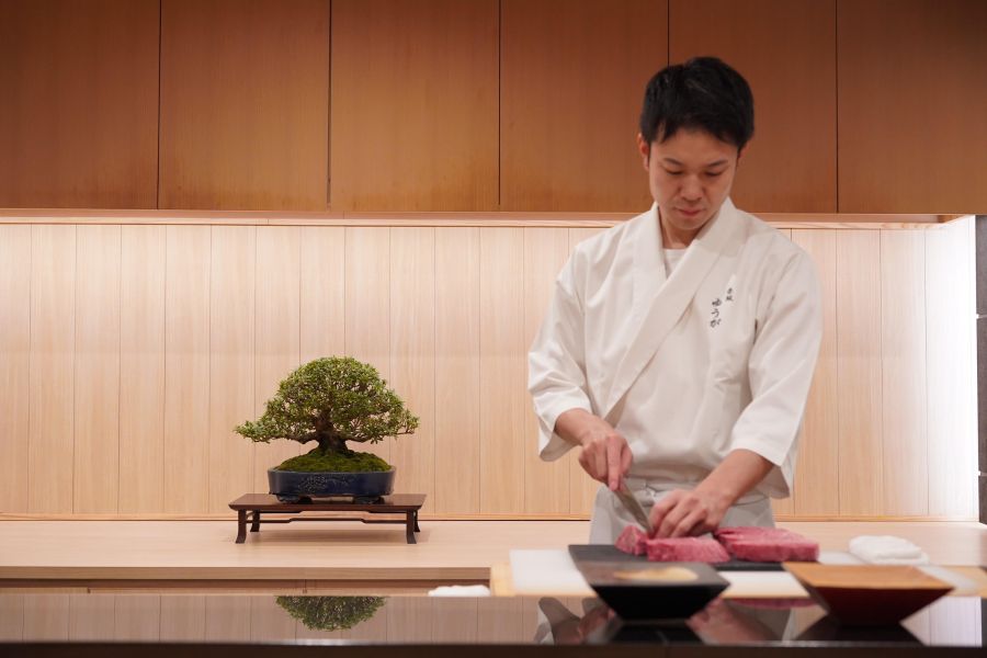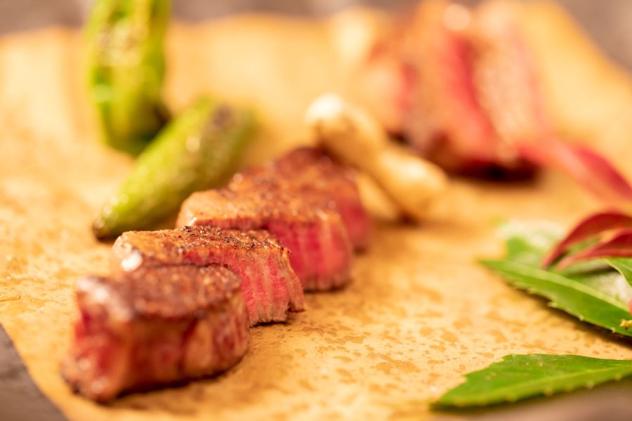 「肉割烹ゆうが」の考える銘肉。ブランドに拘らず最上の黒毛和牛”雌牛”を厳選しましたきめ細かな肉質は霜降りのバランスも良く、濃厚な味わいがご堪能いただけます。また四季を二十四節気の暦で考え、時季ごとの旬の食材を”旬菜”と表現。季節の移ろいを表した、様々な御料理でお出迎えいたします。普段使いから特別な日のおもてなしまで。お客様の日常に寄り添うように、臨場感溢れるカウンターや伝統工芸を設えた半個室で、優雅なひと時をお過ごしください。