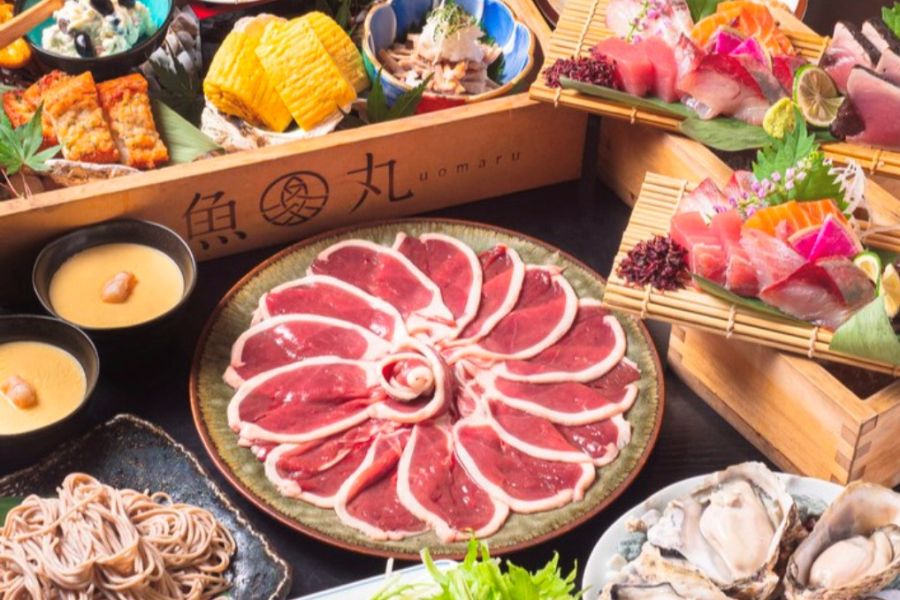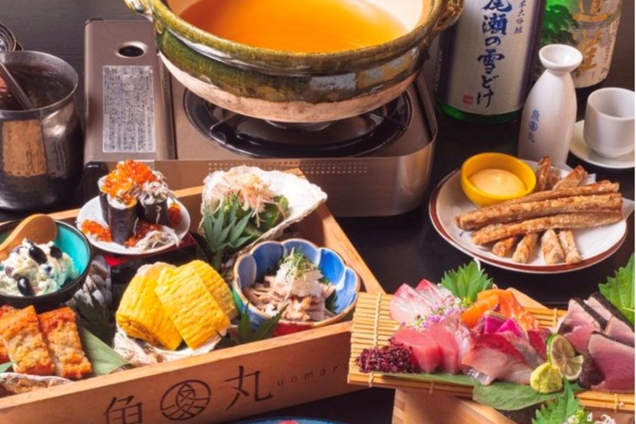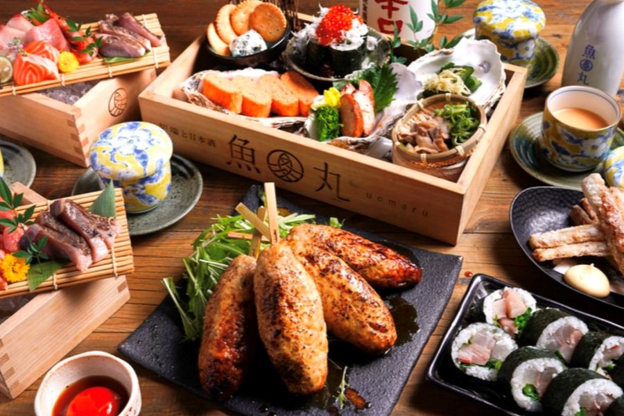 JR南草津駅から徒歩2分の好立地。「鮮魚と炉端焼き 魚丸 南草津店」では、漁港直結の「今朝獲れ鮮魚」を使った刺身や藁焼きが名物。高知直送カツオの藁焼きや、近江牛など土地の恵みを活かした料理が揃います。2時間飲み放題付きコースは5,000円~。店内は木の温もりを感じる和の空間で、貸切対応35~45名、最大宴会45名まで。常時25種以上の日本酒も取り揃え、地酒と海の幸のマリアージュを存分にお楽しみいただけます。