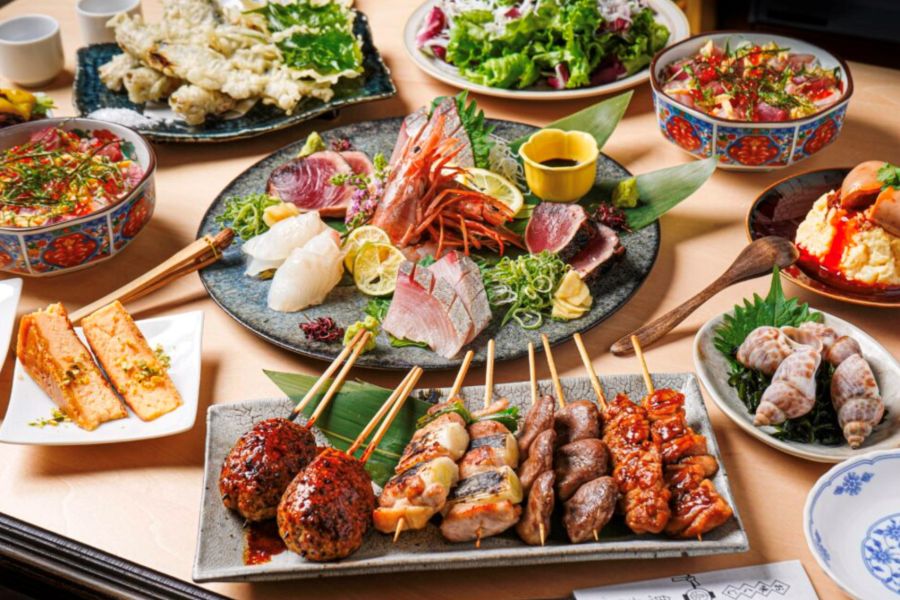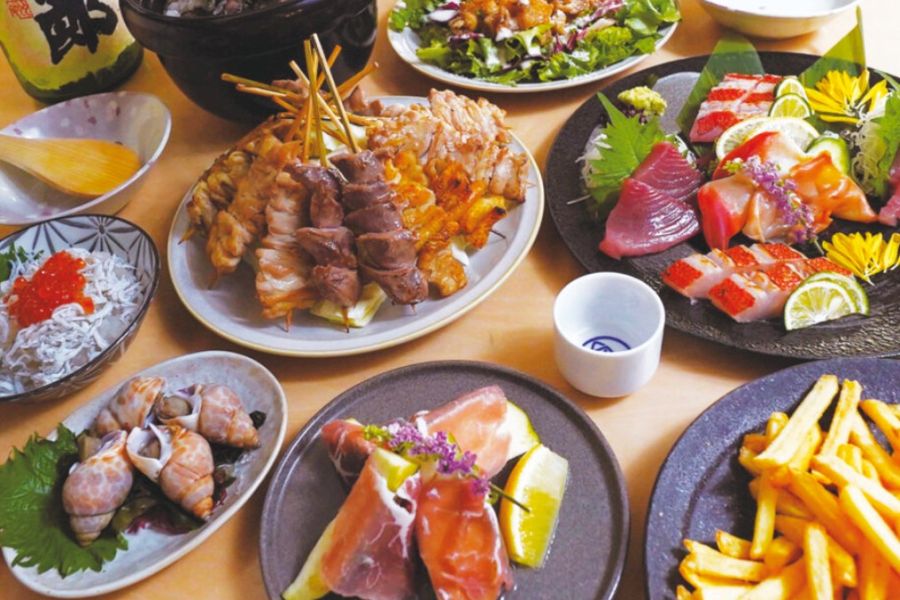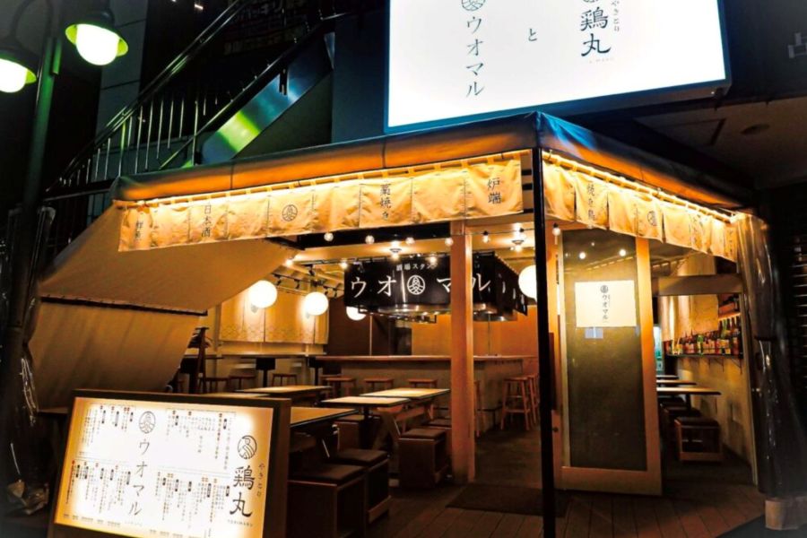 JR石山駅南口徒歩1分、アクセス抜群の「ウオマルと鶏丸 石山店」。福井、高知など漁港直送の鮮魚を、店内で炙る藁焼きや刺身で味わえるとともに、滋賀県産「近江鶏」を備長炭でじっくり焼き上げる焼鳥も看板。120分飲み放題付きコースは4,500円~、魚と鶏の両方を満喫できる全8〜11品プランを用意。店内は78席、50~70名の貸切も可能。25種以上の日本酒とともに、魚と鶏、和の味覚をカジュアルに楽しめる一軒です。