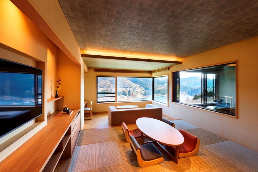 特別室に2泊しました 眼下に眺める芦ノ湖と遊覧船、眺望最高でした。お料理も、夕食、朝食ともに、品があり、とても美味しかったです。お皿も素敵なものばかりで、お料理を引き出してくれていました。お米もとっても美味しかった。 お風呂も、個室風呂も情緒があり、温泉を堪能しました。 しいて言えば、浴場に行く階段が、高齢者や足の不自由な方には厳しいかもです。 手すりや、階段の途中の休憩椅子もあるので、我が家の両親はOKでした。予約個室風呂は階段を必要としないので、そちらなら良いと思います。 3日間至れり尽くせりで、感激しました。また行きます。