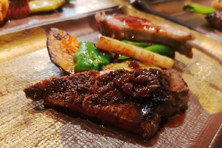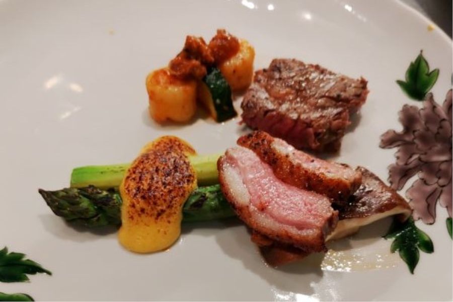 金沢の観光エリア、ひがし茶屋街の中心部にありながら、非常に落ち着いた店内でゆっくりとランチがいただけました。目の前の通りはインバウンド含めて大勢の観光客ですが、店内はとっても静かです。 前菜はとても綺麗で、魚介はスモークされていたりして丁寧に作られてます。 続いて甘鯛の鱗焼き。私は鱗焼きが大好きなんですが、ウロコサクサク、身は火入れ加減良くしっとり。観光地でこの料金で甘鯛鱗焼きは、かなりお得と思いました。盛り付けのお皿も金沢らしくて素敵ですね。 お肉は鴨肉のローストでこちらもきっちりとしたお仕事です。差額600円で能登牛のヒレにできるというので、2人のうちの1人分をそちらにしました。写真はあらかじめシェアして盛り付けてくれてます。ヒレ、とっても柔らかで、かつお肉の味もしっかりした良いお肉でした。 デザートはファンブルトン。そこにイチヂク、ブドウにアイスクリーム。フルーツにしてもとっても質が良いものと分かります。 というわけで、トータル、とてもしっかりとしたお仕事を感じるランチでした♪