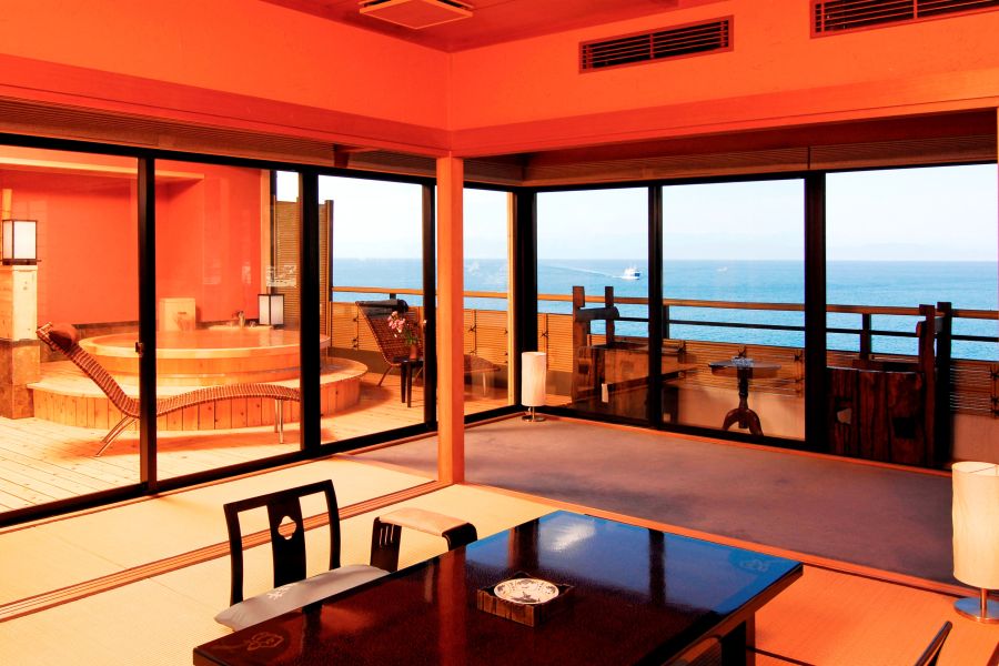 それぞれの旅時間を、お邪魔しないサービス。今までお越しいただいた、多くのお客様のお顔を思い浮かべ、お客様が望まれることは何かをとことん考えました。お客様「それぞれの旅時間」に寄り添うサービススタイルの導入と、居心地の良い空気を感じていただけるように、記憶に残る食事と、心地よいサービスで皆様をお迎えいたします。季節の地元食材を、活かした創作和食をご提供いたします。お部屋では、海風を感じながら、特別な時間をお過ごしいただけます。露天風呂付き客室はもちろん、最上階には特別室もございます。土肥エリア随一の、眺望を誇る景色を楽しみながら、ゆったりとした時間をお過ごしください。