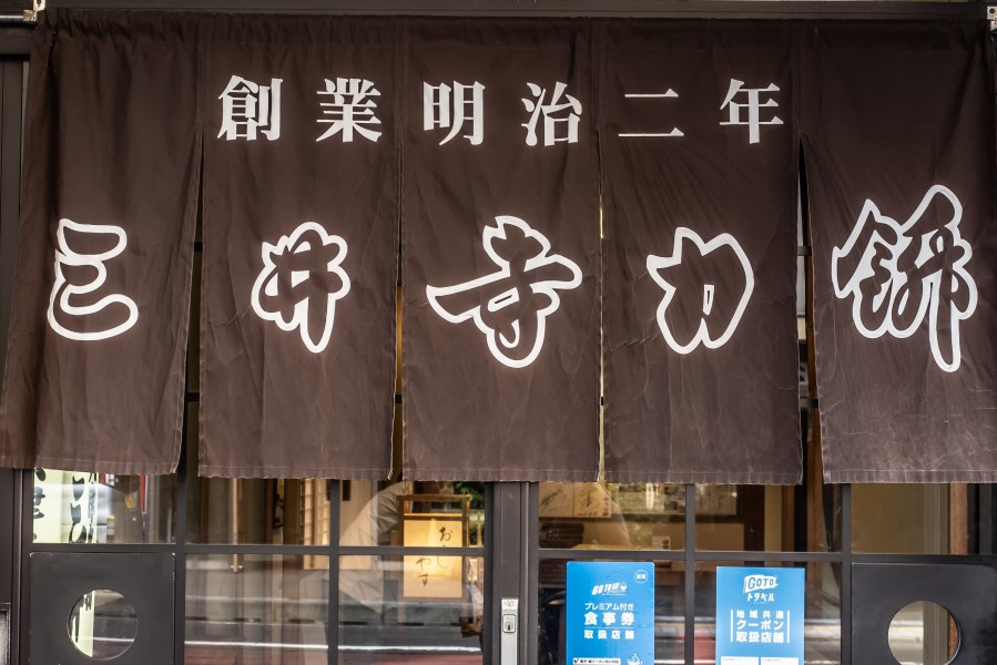 三井寺名物の力餅。お店は手前だけでなく奥にも席がある。餅にきなこがたっぷりまぶされている。お皿にかなりの量がこぼれてしまいもったいない。まさかお皿を舐めまわすことなどできず店を後に。店内では貴重な写真が飾られていた。