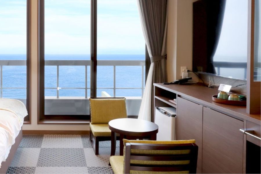海辺に面してホテルがあり、食事(夕食、朝食)とても良かったです。夕食は小鉢でバラエティ豊か、トマト鍋がおいしく、料理長おススメな鰻と湯葉、トロたくや漬け丼、デザートにブリュレなど美味しい、朝食は品数少ないが、パンケーキやドーナツ、海鮮丼、デザートはメロンやオレンジなど工夫されていて満足でした。 部屋はカビ臭いのがきになり、テレビが70インチありNetflixが見れる、ベット寝心地良く、枕は硬めと柔らいので2つセットしてあり最高に良かった。バス、トイレ付きだったがトイレがベットの横にあり、入り口にバスと洗面台、バスはシャワーのみ、横に洗面台付きでドライヤー付きでした。トイレは手洗いがなく、ベット横からから洗面台に手洗いに行く動線が面白い。 冷蔵庫は冷凍庫はなく、保冷剤を凍らせることが出来なかった。セットアップの寝巻きありで色が上下組み合わせに違和感あり。風呂用カゴ、タビと上着、ロクシタンのプレゼント付きでオシャレです。自動販売機は値段が高い、ドリンクの種類もあまりないが、アルコールもある。大浴場は大きくないが、海に面してあって露天風呂も良かった。貸し切り風呂はなし、外にもお風呂があったが行かなかった。 評価は部屋は匂いが気になり星4、サービスは食事の接客が少し悪いので星4、場所は良いです。リピートしたい宿です