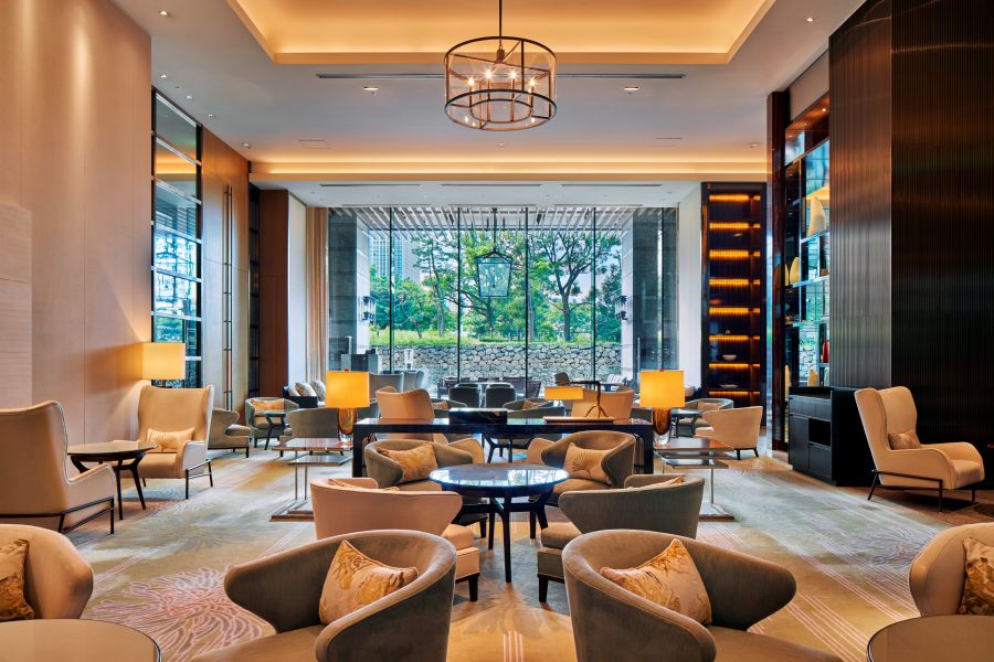 東京都千代田区丸の内1-1-1に位置するパレスホテル東京内のロビーラウンジ。豊かな緑が窓外に広がる、寛ぎの空間。暖炉と本棚が、自宅のリビングのようなくつろぎ感を醸し出します。輪島塗漆器で提供されるアフタヌーンティー"Stones"とともに楽しむ世界のお茶や、生演奏に浸りながらのバータイムなど、ホテルならではのエレガントなひとときをご堪能いただけます。