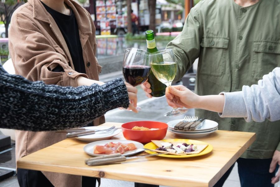 ビール、ワイン飲み放題で、簡単に食事の付く4000円コースを注文。 これはテラス席限定だったようで、この日は木枯し一号が吹く風の中でしたが、皆さん寒さに耐えながらの利用でした。風で食事も飛んでしまうくらいなので、店内はガラガラだったから店内誘導いただいてもよかったのかなとは思います。(混んだらテラス移動の前提付きでも) ビールは空で、泡があふれる感じで残念だったけど、ワインは素晴らしい! 6種類が飲み放題でスパークリングもあり最高!!カクテル系も飲めてとても良かったです! 料理は少ないかと思いきや十分。また行きたい!