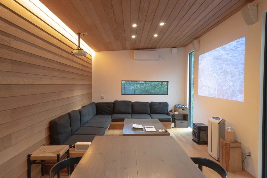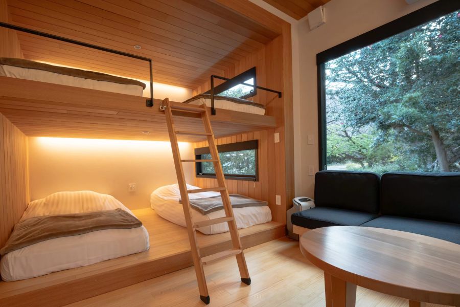 今までのトレーラーハウス製作のノウハウをふんだんに詰め込んだ、ワンランク上のハイエンドなTiny Baseです。リビングトレーラー内は、シンプルモダン。ピクチャーウインドウから差し込む光と溢れる緑が、木をふんだんに使った室内を照らし美しい空間になっています。当宿泊施設初のファイヤーピットも。最大8名様まで宿泊可能。ファミリー2グループや友人同士のご宿泊に最適です。