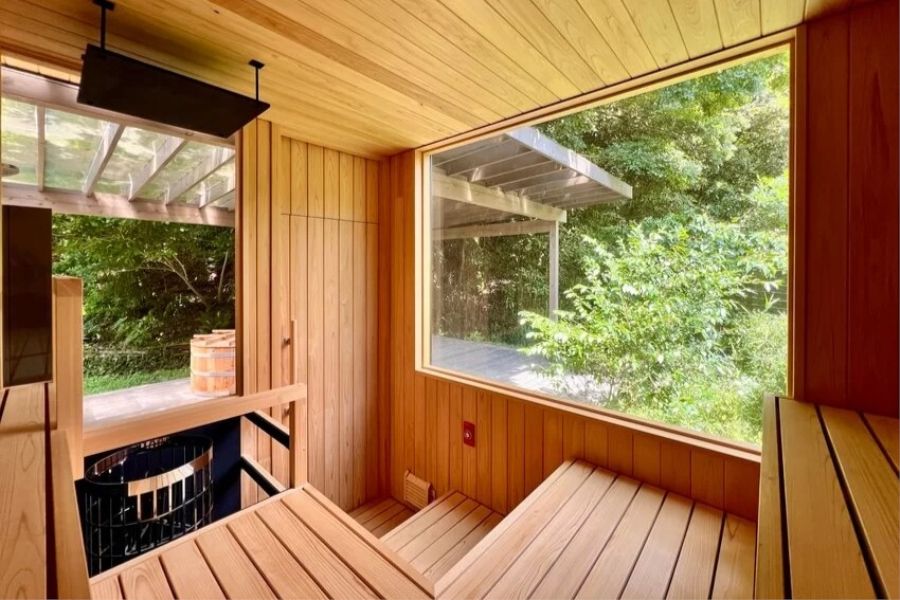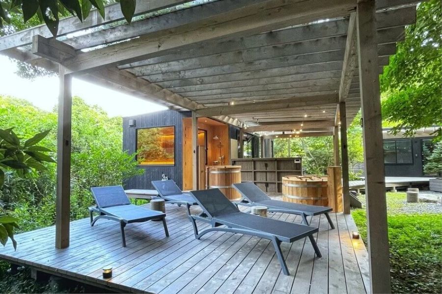 サウナ付きコテージの完成形です。 まず到着したらサウナのスイッチをオンにしましょう。ちゃんと温度が上がりきるのに2時間くらいかかります。お風呂は2つあるので、温浴と水風呂を作ることができます。インフィニティチェアがあるのと、自然の中なので整う環境は揃ってます。 サウナの後をしっかりしたキッチンがあるので、近くのスーパーで買い出しをしてBBQをして楽しみました。 夜は室内でゆっくり過ごしました。 寝室には通常のお風呂もあるので、それも嬉しいポイントです。