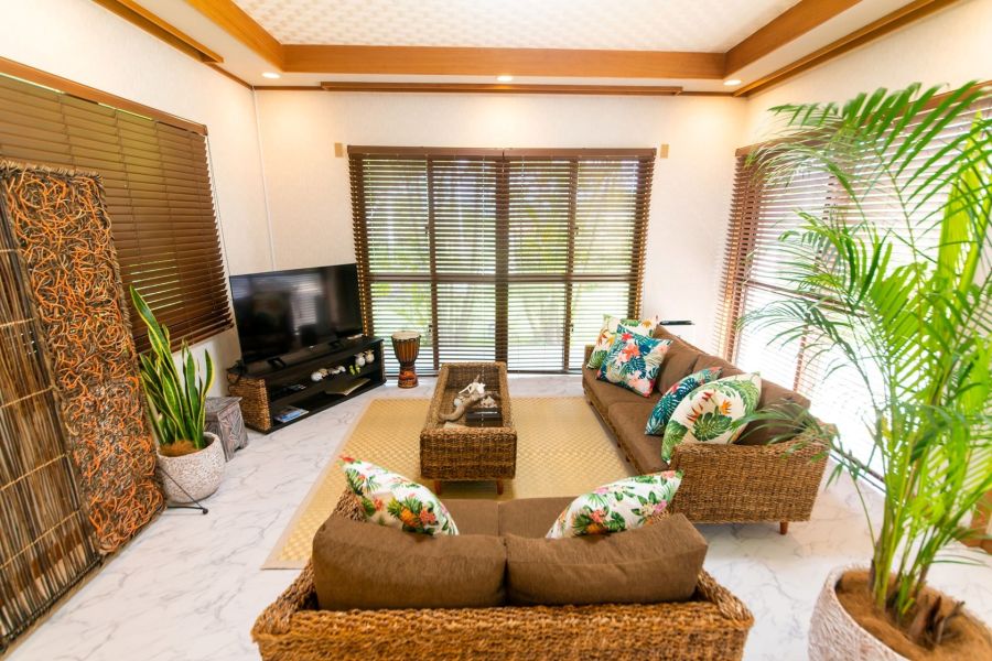 石垣島を代表する景勝地「玉取崎展望台」直下に位置し、空港から車で15分の場所にある1日1組限定の貸切別荘です。沖縄の赤瓦を携えた伝統的な雰囲気と、広い芝生が印象的なリゾートヴィラで、最大8名まで宿泊可能です。アジアンテイストの調度品にこだわった室内空間、本格的な和室、設備の整ったキッチンを備え、ご自宅のようなプライベート空間で長期滞在も快適に過ごせます。白砂のナータビーチまで徒歩5分という好立地も魅力です。