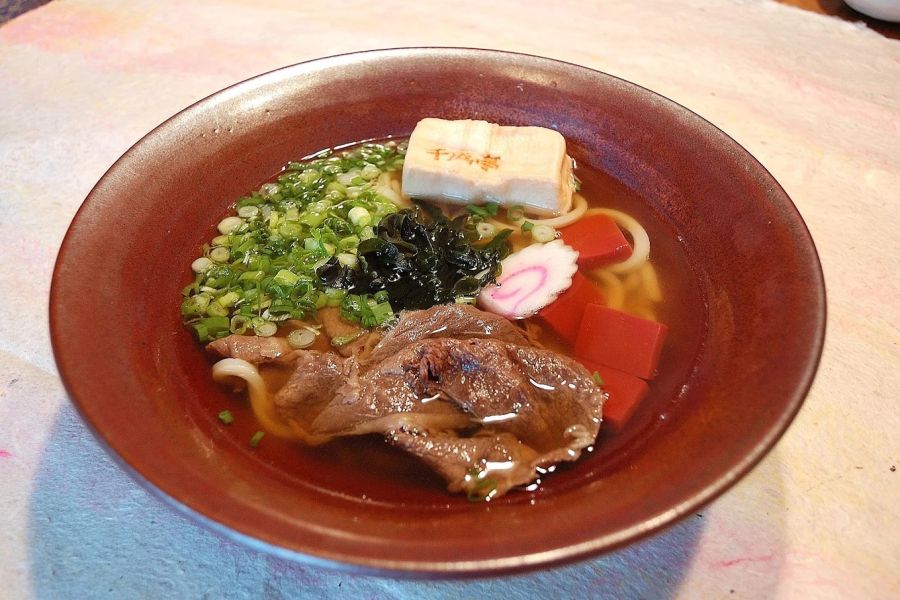 井伊の赤備え鎮座する御席で、近江の名産品がのった「十三代目」饂飩をいただきました。この名前は、茶道、歌道、能楽(ちゃ・か・ぽん)に精通した文化人として知られた十三代目藩主の井伊直弼公から来たものだそうです。近江の名産品である近江牛(江戸時代から飼育と食用が許された歴史と近年の研究が生きる日本三大和牛)、赤こんにゃく(鉄分で処理されることで肌理細かさと独特な臭みが少ない)、丁字麩(輸送の効率化から四角にした結果もちもちの歯ごたえも得た)、そしてワカメとネギ、ナルトが添えられています。 それに「追い近江牛」というオプションが! 近江の名産食材をあしらった彦根の饂飩と近江牛の握り、観光客として正しいなーと大満足。選んで良かった!