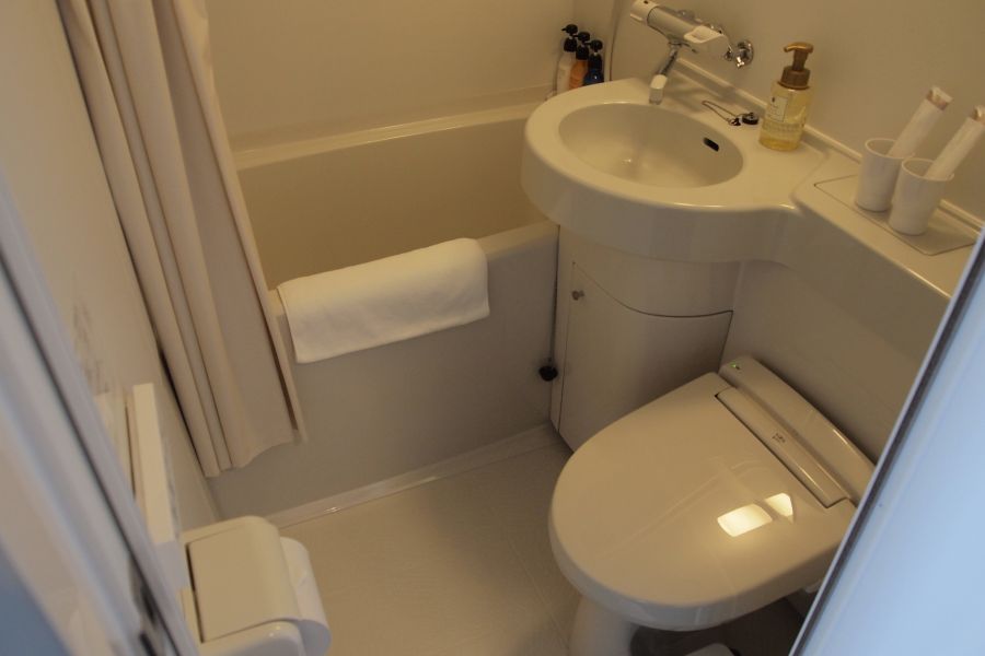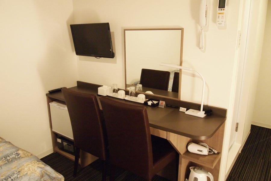 村山駅の西口への階段降りてすぐにホテルの入口があります。チェックイン前でも荷物を預けられます。受付カウンターの近くにアメニティーコーナーがあります。特に良かったのはお茶の種類が豊富な点です。普通の緑茶はもちろんうめ茶、ブレンディのスティックタイプもいろいろ種類があって、カフェインレスのカフェオレもありとてもサービスいいなと思いました。女性大風呂は専用キーで入るようになっているので、入口は1階にありますが、安心して利用できました。お風呂の手前にウォーターサーバーがあり、特に常温のお水が選べたのは嬉しかったです。 ビジネスホテルで大浴場があるのは有難いですね。でも、場所が小さいので、脱衣場のカゴは9個、浴室内の蛇口は3つしかないのと、洗い場のすぐ後ろが浴槽なので洗ってる人のシャワーの飛沫が場合によっては浴槽内に入ってしまう近さなのが気になりました。ドライヤーは2つしかないので、混んでる時間帯はだいぶ狭いと思います。 部屋のベッドのスプリングは硬くて、掛け布団のカバーは挟んであるだけなので、すぐ取れてしまって、イマイチ寝ずらく感じましたが、枕元にコンセントも部屋の電気のスイッチもあって使い勝手は良かったです。 フロントの方の対応も悪くなかったので、総じて良いビジネスホテルで、また利用してもいいと思えました。