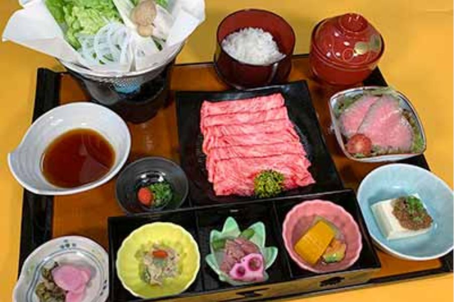 湖東三山の定期観光バスの昼食でお世話になりました。「湖東三山すき焼き紅葉御膳」でしたが、近江牛のすき焼き、刺身?、寿司などどれもとても美味しかったです😊