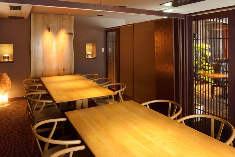 和風モダンな店内で特別な時間をお楽しみください。選りすぐった近江牛ステーキコースと懐石料理とワインを約150本ご用意いたしております。