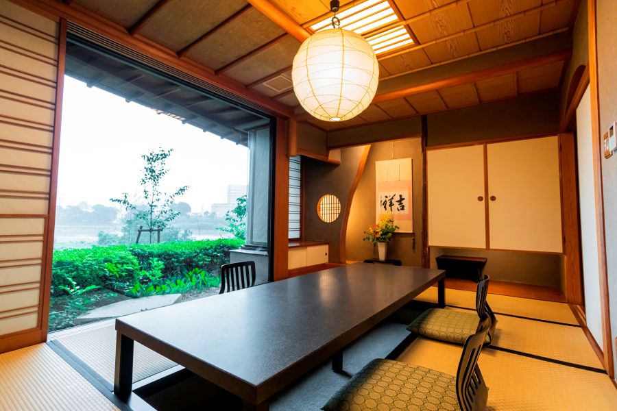 全席完全個室でゆったりとした御食事を。当店の個室から眺める景色は、群馬県の象徴である「赤城山」と「利根川」を一望できるお席となっております。また、夜は群馬大橋もライトアップされ、非常に綺麗な景観となっておりますので、お料理と共に贅沢にお愉しみいただけます。