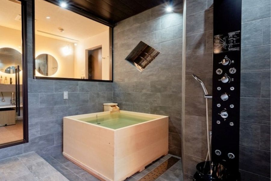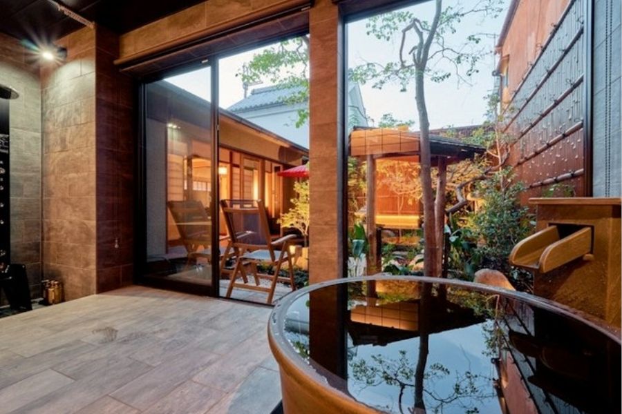 貸切宿の完全プライベートサウナ。ヒノキ風呂、サウナで汗を掻き、奈良町の地下水で体を冷やし、庭のリラックスチェアで整える。土地の魅力を存分に味わいながら、贅沢な空間で「ととのう」感覚を体験していただけます。奈良観光で疲れた体を蒸風呂邸で癒して下さい。