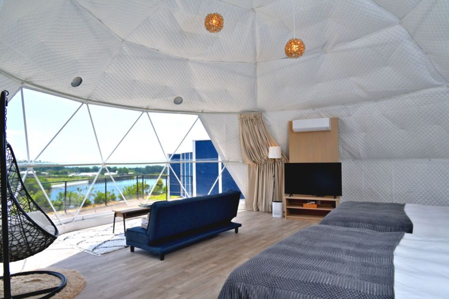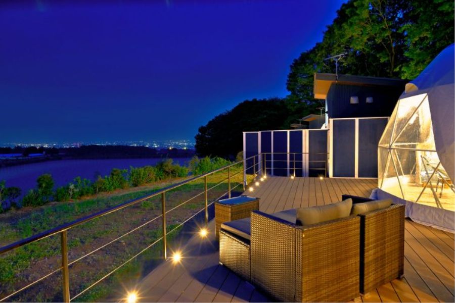 お盆にお世話になりました。 2024年Openということであまりレビューが無かった為、おっかなびっくり行きましたが…大変満足で素敵なグランピングになりました。 ありがとうございました! 気になったところや良いと思ったところの詳細なレビューを書いていきますね。 ★ドームテント 良かった点。 ・6mのスタンダードタイプに宿泊したが、清潔で綺麗だった。 ・ベッドはシモンズ製のマットレスで寝心地がいい。 気になった点 ・TVは見れるがTVのアプリの回線が弱い。NetflixやYouTubeは観れるけど、読み込みが遅かったり途中で止まる。 ・Wi-Fiがないと電波が一本しか立たない。Wi-Fiに繋げば大丈夫。 ・ドームテントなので壁が薄く、雨の音や蝉などの虫の声が聞こえやすい。また、部屋同士も近いため、耳を澄ますと隣の部屋の声や物音が少し聞こえる。 ★キッチン 良かった点 ・食事が美味しいし、割と量がある。食材の説明と食べ方が書いてある。 ・調味料がいっぱいある。 ・エアコンが涼しくて、夏場でも調理が楽だった。 ・ピンチョスと牛肉がうまい! 気になった点 ・夜は室内の灯りに吸い寄せられて、窓の外で虫がいっぱい踊ってる。 ・魚と牛肉は2人で1枚しかなかった。 ・持ち込み禁止の食べ物がある。たしかケーキや刺身、納豆、クサヤ、ブルーチーズなどはNG。肉類やエビ、貝類は大丈夫だった気がする。チェックインした時に紙で説明される。 ・電子レンジなし。トースターと電気ケトルはある。 ・グリルが本格的なため、着火する時に少し怖い。ガス注意。 ★お風呂 良かった点 ・お風呂が広くて気持ちいい。温度も調節できた。 ・窓を開けると風が入ってきて、夏はちょうどいい。 ・ヒノキのいい香りがした。 気になった点 ・排水溝の流れが悪かった。 ★ウッドデッキ 良かった点 ・湖に鳥が泳いでいてかわいい。 ・遠くに街の明かりが小さく見えて綺麗。 気になった点 ・雨の日だと外のソファーは使えない。 ★トイレ 良かった点 ・清潔で綺麗 気になった点 ・なし ★周辺環境 良かった点 ・山の上にあるので、周りは何もなく静か。 ・車で7分ほど降ると市街地に出るので、小さいがコープや、セブン、ローソンがある。 気になった点 ・他の方のレビューにある通り、外は確かに少し臭いがした。(私達は特に気にしませんでした) ★スタッフ ・外国の方がとても優しく丁寧にサービスしてくれました。 総じてとても満足でしたが、今後の期待も込めて★4です。 今度は家族と皆で来たいです。ありがとうございました!