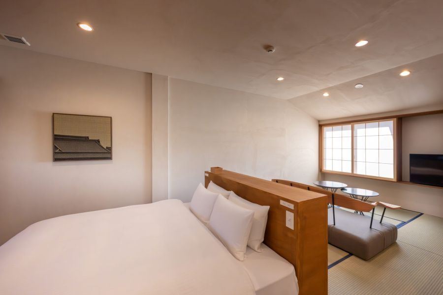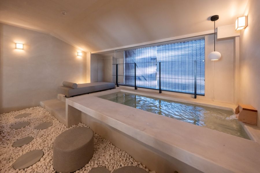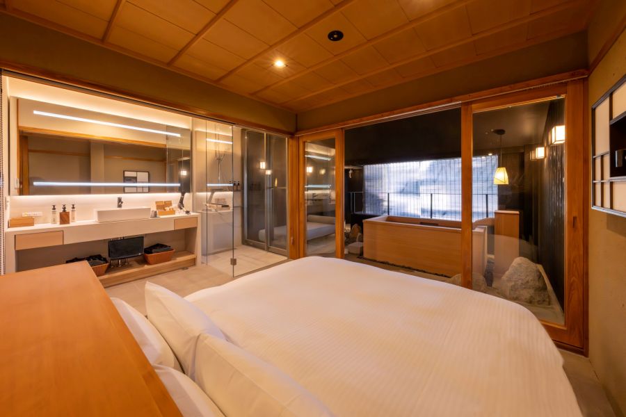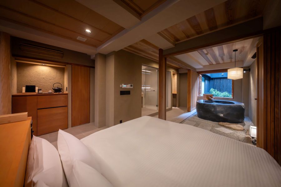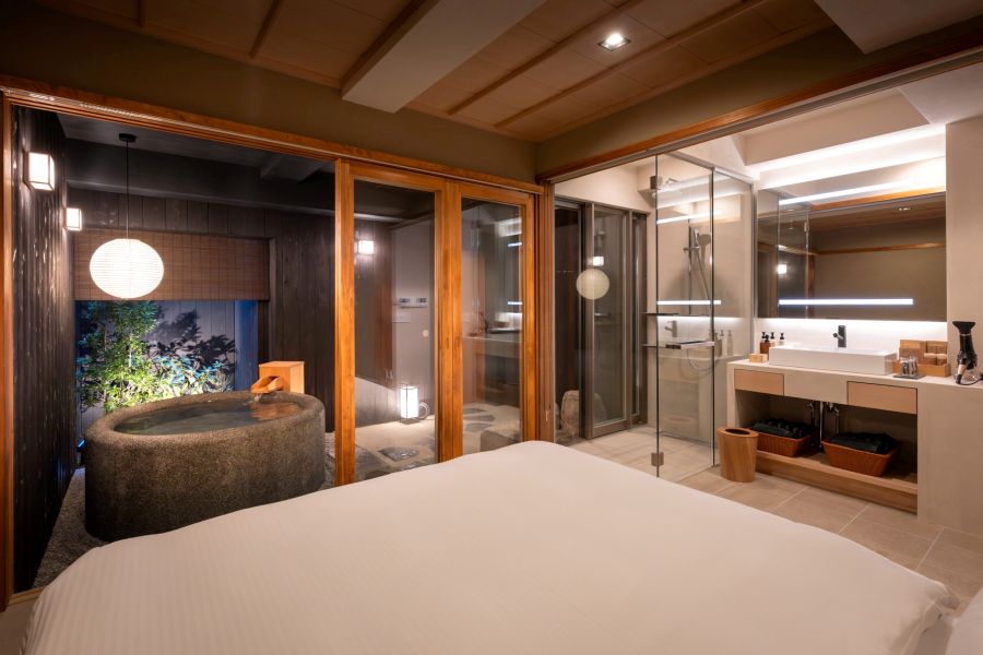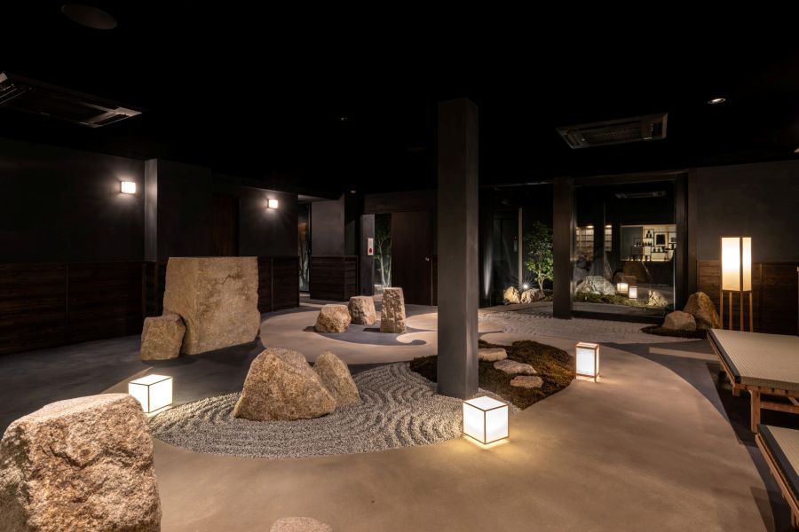 Nazuna京都西本願寺は、西本願寺のほど近くに佇む宿泊施設です。1階ロビーには、現代作庭家・重森千青氏が監修した枯山水の石庭が広がり、白砂と石、苔が織りなす静寂の美が訪れる人を迎えます。一部の客室には石庭を意匠に取り入れた露天風呂・半露天風呂を備え、湯に浸かりながら自然と調和する時間をお過ごしいただけます。京都の精神性と現代美を融合させた空間で、静けさと余白に包まれる滞在体験をご堪能ください。
