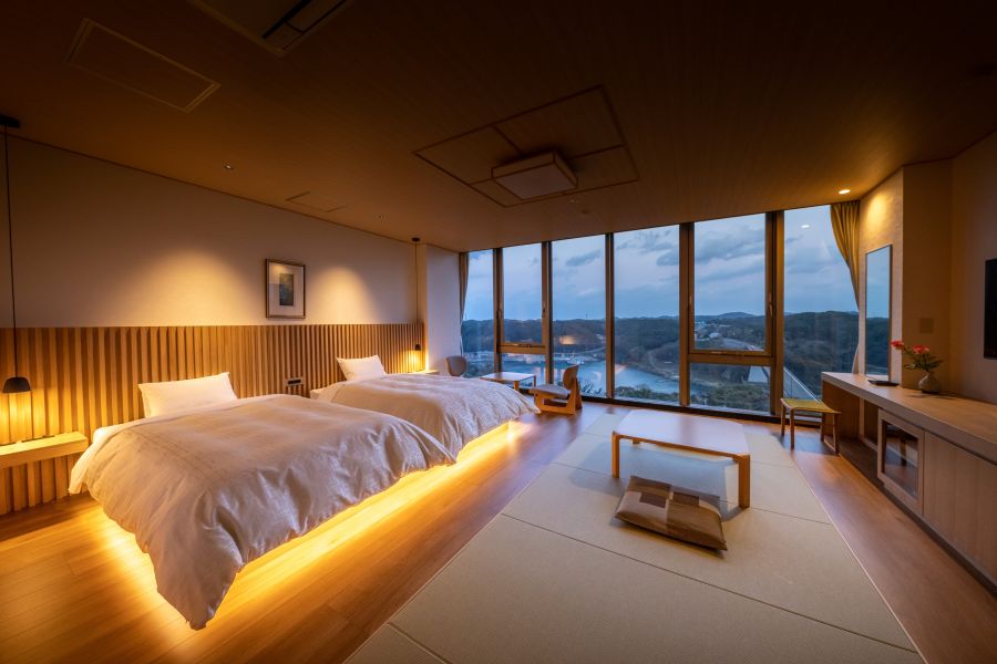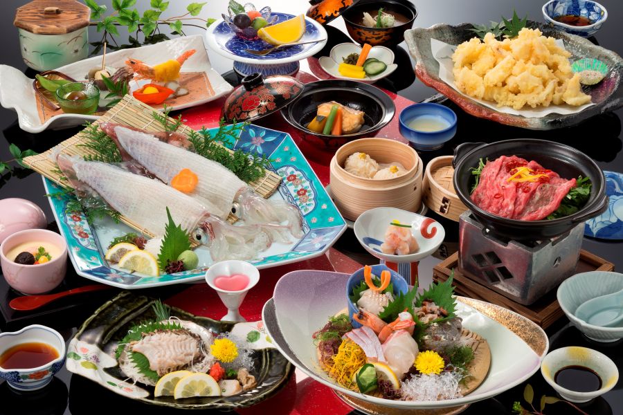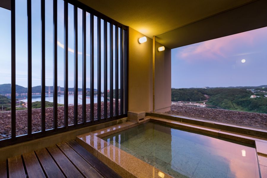 玄界灘を望む高台に佇む「観光ホテル大望閣」は、海側全面ガラス張りの大きな窓から、朝日・夕景・漁火まで移り変わる絶景を楽しめる宿です。呼子名物・活イカをはじめ、玄界灘の旬をふんだんに使った会席料理は、鮮度と美味しさにこだわった自慢の品々。豊かな海の恵みと丁寧な仕込みで、旅の醍醐味を味わっていただけます。大浴場では海風を感じながらゆったりと寛ぎ、心に残るひとときをお過ごしください。